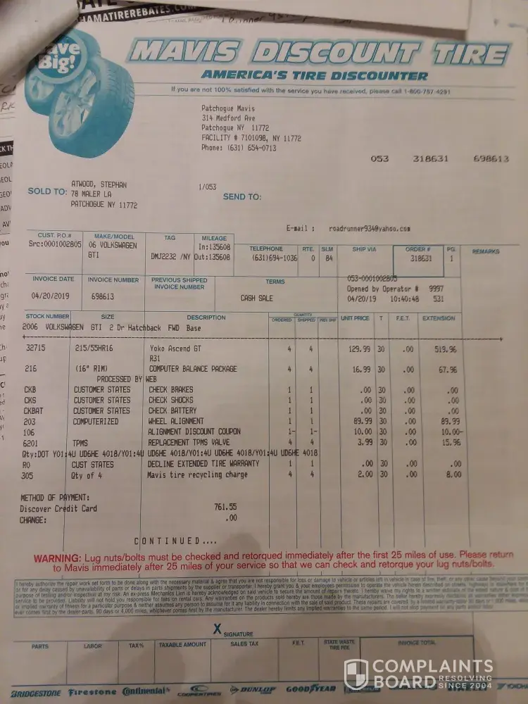 We went to Mavis April 24th to replace 2 tires from potholes which were insured. They weren't able to get the tires for several days. When we asked the manager why he informed us that we had bought [censored] TIRES. These being the same tires we bought there for years on the recommendation of the previous manager. When we finally were able to pick up the car the same manager who told us they had been selling us [censored] tires for years informed us that he put one of the same tires back on our car with the other one being different and more exspensive. He never asked us if that was what we wanted. So now we have 3 [censored] tires on our car, in the managers words. One totally different tire that he put on without our approval and more exspensive. And to top all this off he wasn't insuring our tires anymore. This is how you treat one of your best customers for over 10 years? The Long Beach New York shop is totally unprofessional, rude and a ripoff