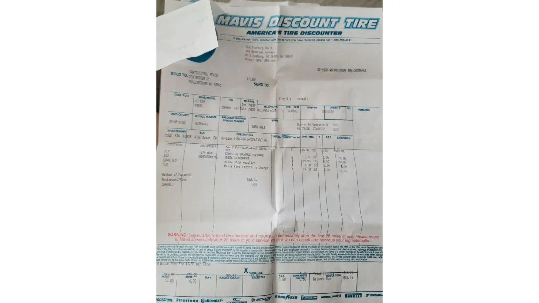 I made an appointment with Mavis in Freehold, NJ on Rt 9. I am waiting on final price, etc. Due to this Mavis being a different location than the original install Mavis location, I understand if this location has to charge me.