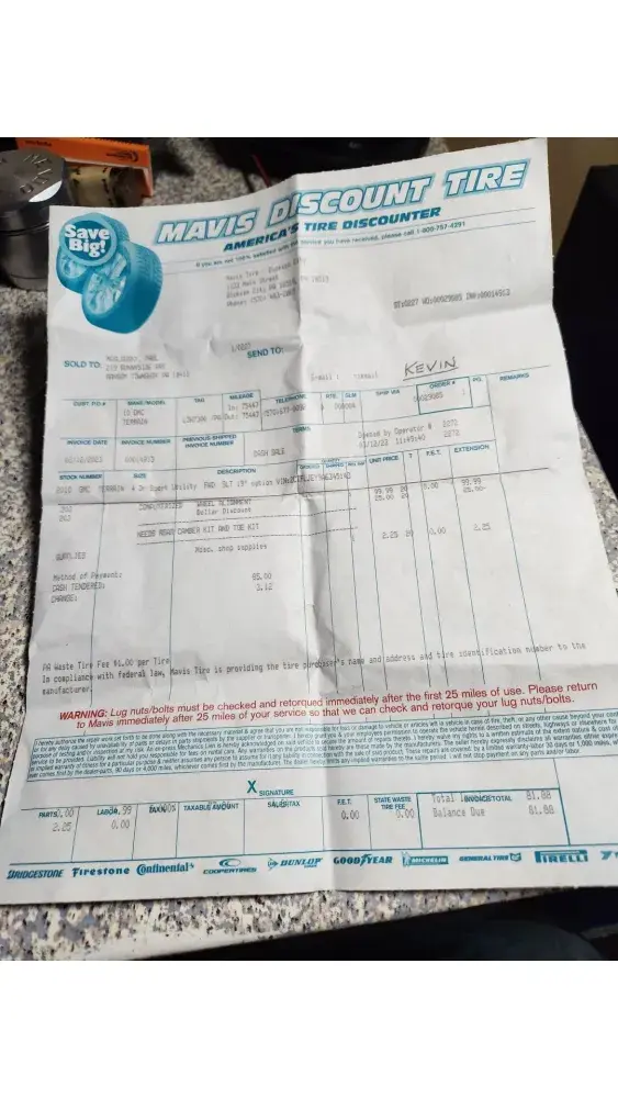 Purchased Tires from Amazon. Had them mounted at Keyser Oak Store. Wanted an alignment, but machine was broke and I was sent to Dickson City Store. I paid for alignment, then was told the back tires could not be aligned without a cam and toe kit. I was given prices for the parts and labor. I was told $280.00 without tax plus the cost of the alignment. I told him not to order parts.