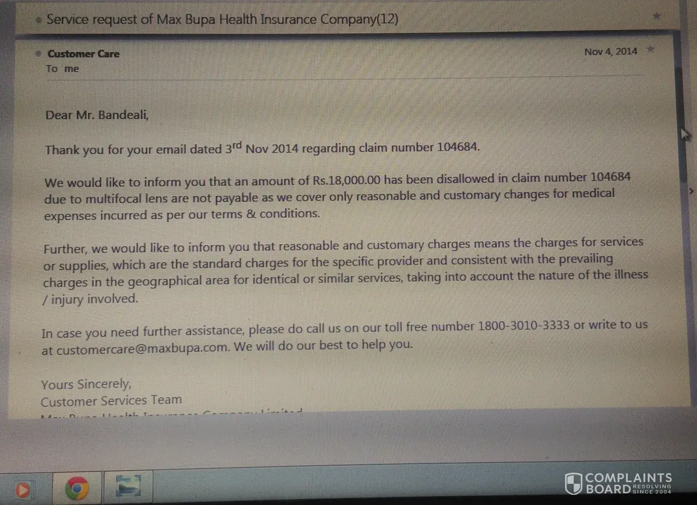 We have been awaiting your response. Please get in touch with us by emailing us on customercare@maxbupa.com or call us on Toll Free number [protected] to help us resolve your complaint.