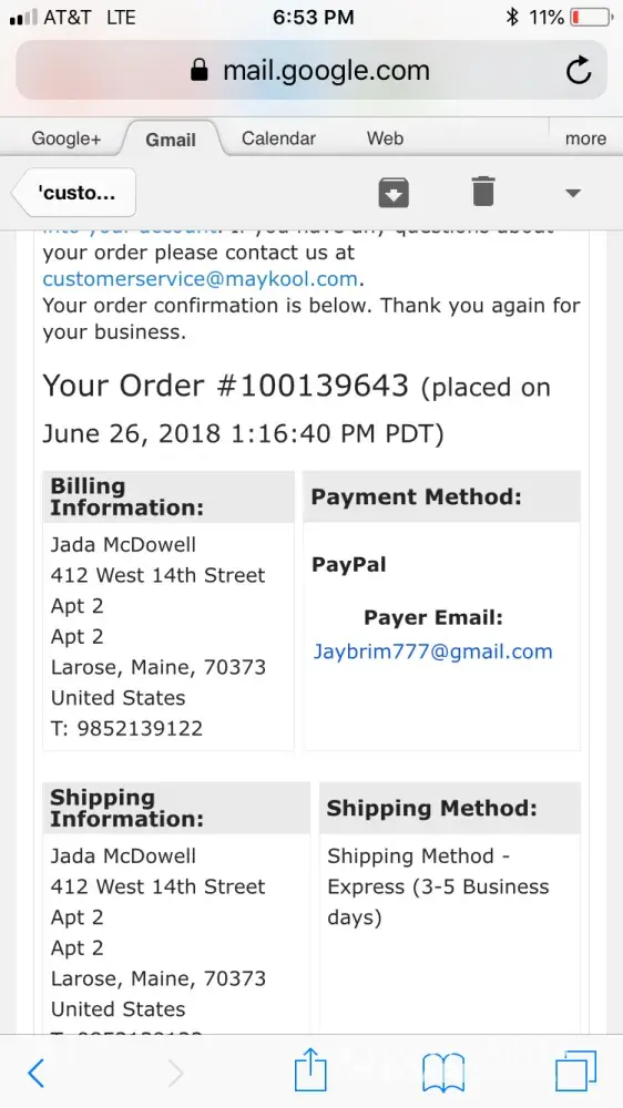 The shipping address was wrong I have now fixed it, it is 412 West 14th Street Apt 2 Larose Louisiana I would like notice once you get this confirmation evasive you guys initially told me you couldn't find the address you have not been emailing back so I'm not quite sure if you got the memo on your original gmail account but this is the correct information I also have it fixed on the maykool website