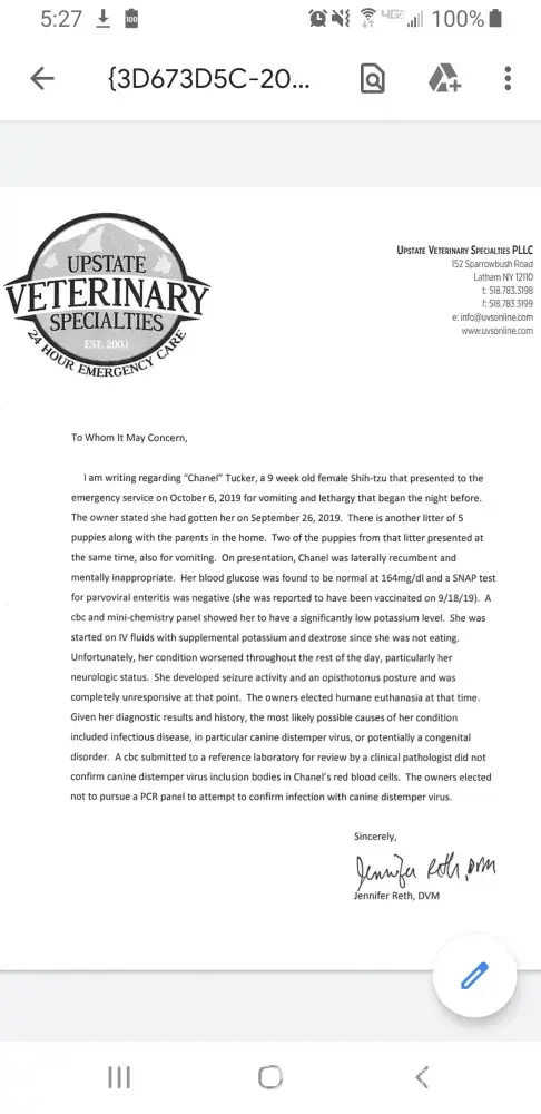 Well, Ms Robin Mayne, I will happily be posting ALL the vet documents I have (which your vet also received) including the letter from the vet stating your puppy died from CONGENITAL DEFECTS. Yep, distemper is mentioned, however, if she had distemper, ALL my dogs would be dead. Also, as per one of the recorded phone conversations with my vet, which I sent TO you, the vet stated it was HIGHLY UNLIKELY to be distemper due to the lab results finding a lack of inclusions in bloodwork. You are a large scale commercial puppy mill that turns over more puppies than you can even remember. You offer NO DNA or health testing on ANY of your dogs or puppies, thus increasing the likelihood of producing puppies with underlying congenital defects that no one knows about until it's too late. I produce 1 litter per year of DNA/HEALTH TESTED pups. MY 2 puppies became ill ONLY after YOUR puppy came here. They were in perfect health prior, and none of my other puppies or any of my 3 adult dogs became sick until YOUR pup arrived. YOUR puppy was sick before any of mine. MY puppies vomited for a couple days and made a very quickly full recovery. They are healthy and happy. YOUR puppy was (as per the vet) neurologically inappropriate and practically comatose, thus the need for her to be euthanized. Funny how SHE died yet mine are fine? There was NO mention of toxins by my vet. In fact, the vet paperwork, which readers can see for themselves, flat out states TOXINS: NONE KNOWN. There are NO toxins even IN my home, as I have full time indoor dogs and young children. (unlike your dogs living in gross, dirty cages...of which I have video YOU sent me!) Sadly, you refuse to stand by your own contract and by NYS law. A simple refund for her purchase cost would have sufficed and you know that. I didnt even get an apology. But no, you prefer to take this matter to court. This is what gives breeders such a bad rap. Sorry, but that's the truth whether you like it or not. Such a shame...