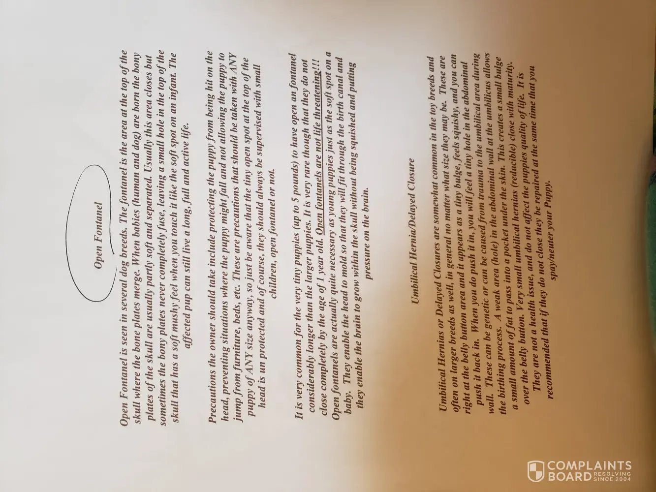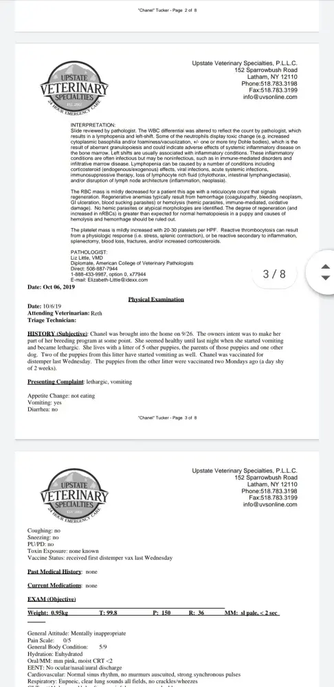 Robins puppy was born defective. As per Robin's own veterinarian, the puppy I purchased had an open fontanel as of Sept 25 2019. Documentation was provided to me. While this isnt always life threatening or serious, it can also become deadly. I have attached screenshots of things that can happen to a puppy with an open fontanel. The puppy purchased did MANY of those exact things prior to her death. My own veterinarian report states they actually suspected hydrocephalus, which is a condition seen in puppies with an open fontanel. If you look at the bottom right corner of Robins own vet report, you will see the info about the open fontanel. Robin also provided me written information about this condition and told me not to worry. Clearly she was mistaken. If you look at the vet reports I previously provided, you can specifically see where congenital hydrocephalus was suspected. None of this matters to Robin though
