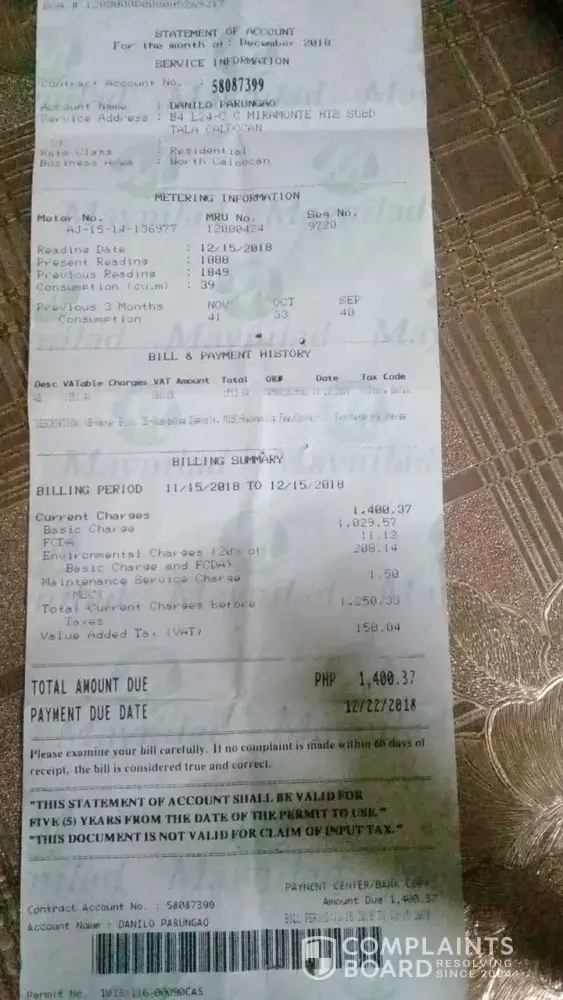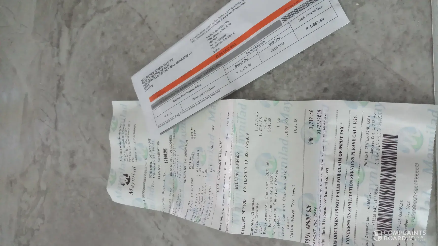 Gusto ko lang iraise yung billing namen for September 2018. From around 250-350 PHP e naging 6, 700 PHP yung bill namen. Nakakapagaka lang kasi wala naman kaming leak sa loob ng bahay and ito pa yung month na may water interruption. Then may kumausap samen na tiga Maynilad (Ding is his name) na need daw mabayaran yun at puputulan daw kami. Sabi pa niya na yun daw kasi ang nakalagay sa reading upon their investigation. Sana iinvestigate mabuti kasi RESIDENTIAL lang kami at hindi semi-business or commercial space. Wala kaming kalaban laban na babayaran namen yung 6, 700 na bill sa tubig tas kung hindi e mapuputulan kami knowing na necessity ang tubig sa isang bahay. Mula nung ginawa yung kalye namen e biglang taas na ng billing namen sa tubig. Magawan sana ng immediate action with regards to this matter.