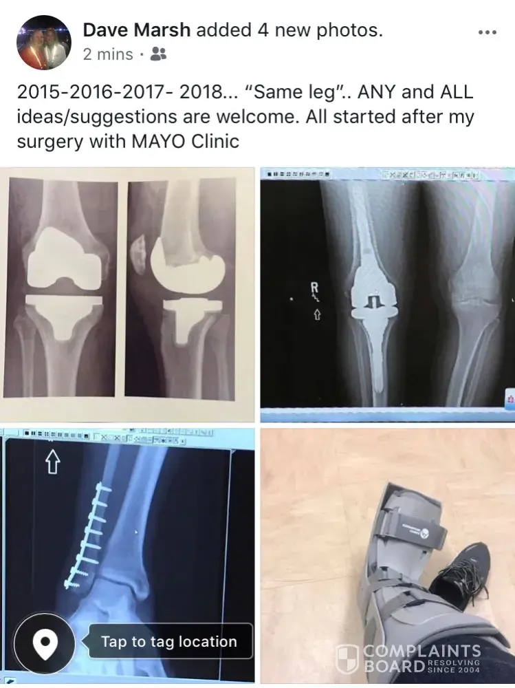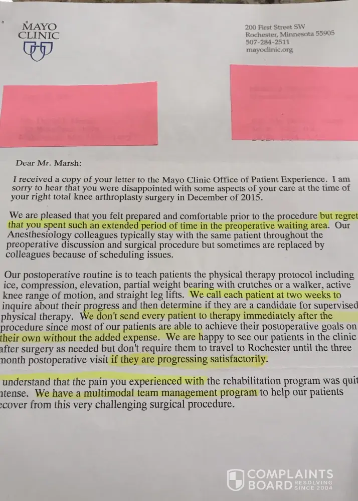 Had my knee replaced December 2015. Twenty One months later another clinic did Reconstructive Surgery. The EXPERIENCE was much better. After the first surgery I did not attend a Physical Theraphy due to a booklet MAYO gave me and a discussion with the Surgeon . MAYO as of yesterday says I was to attend PT. However the doctor sent a letter a few months ago after I complained, The we do not send every patient to PT after a 2 week follow up phone call . That phone call happened however my records indicate no one told me I was a candidate for Physical Theraphy . I have several after surgery documents that never mention PT. I received a booklet of exercises to perform at home per the Surgeons conversation prior to surgery . Also, a check list document for Pre Surgery and Post Surgery states, when you get home continue to do the exercises you learned in the hospital. I feel strongly that if, I had gone to PT after the surgery the revision surgery would have not been necessary.
