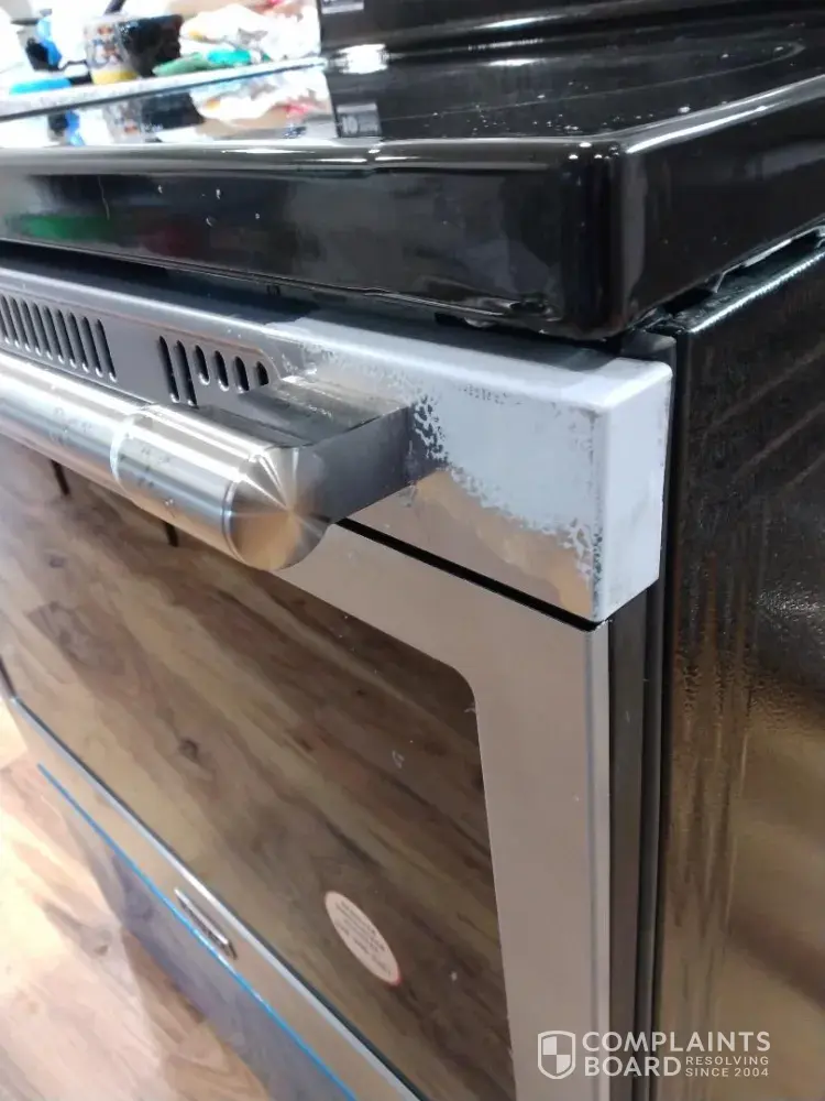 Bought new range at Menards, was delivered with many other items I had bought, windows, doors, other building materials as I am building a new house and the delivery fee is $170.00. That is why appliances were bought early. Were unopened for a while and when stove was opened, the door was not completely painted. Should not be on a new appliance, nor in a new home. Maytag will not correct the situation, said it was over 30 days. I asked them to send a new door, wanted delivery date, picture of door. I have done all those things, no response even though I have reached out more times.