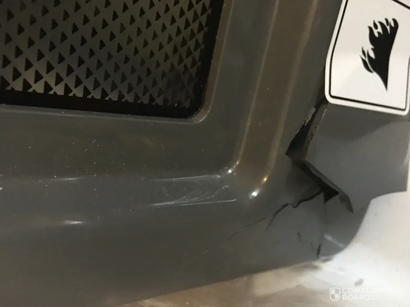 Small plastic part on bottom of right door is broken (see enclosed photo)