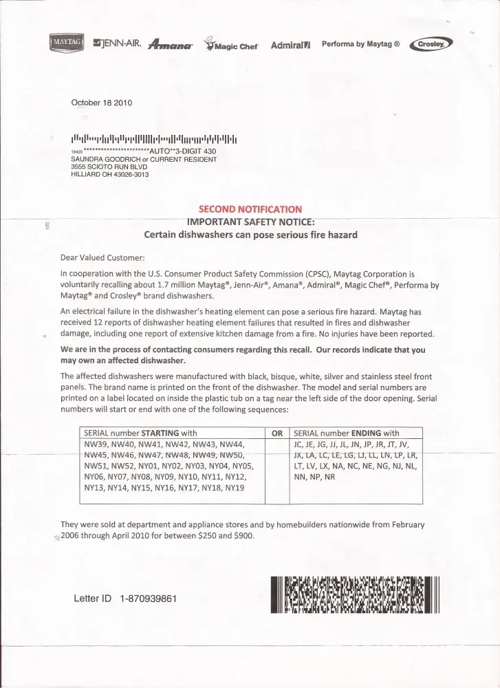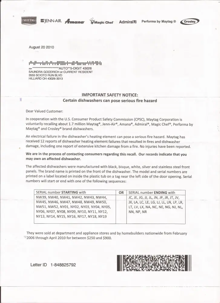 My Maytag dishwasher was new in 2009. It was the subject of a recall in 2010 and the recommended repair was made. The recall related to the control panel. In 2014 the replacement control panel went bad and was replaced at my own expense ($96.75). Now the control panel doesn't work again. The repair company says it's out of warranty so I would have to pay to replace it again. It seems to me that they are just replacing one faulty part with another of the same so this is not a long-term solution. I am a retired widow on a fixed income. I cannot afford to keep repairing this product, nor can I afford to buy a new dishwasher (which you can bet would not be a Maytag). I feel I am entitled to at least a free replacement of the control panel. The rest of the dishwasher seems to be perfectly fine; it also seems obvious that this part is still not holding up to the standards one would expect.
