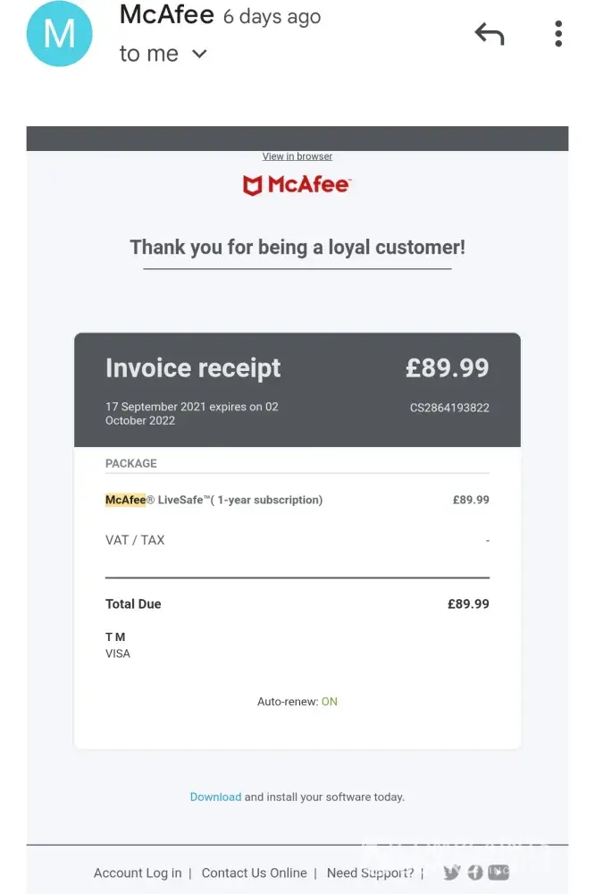 I have received unexpected renewal for McAfee® Total Protection - 5 Devices in US dollar price AUD $156.65.