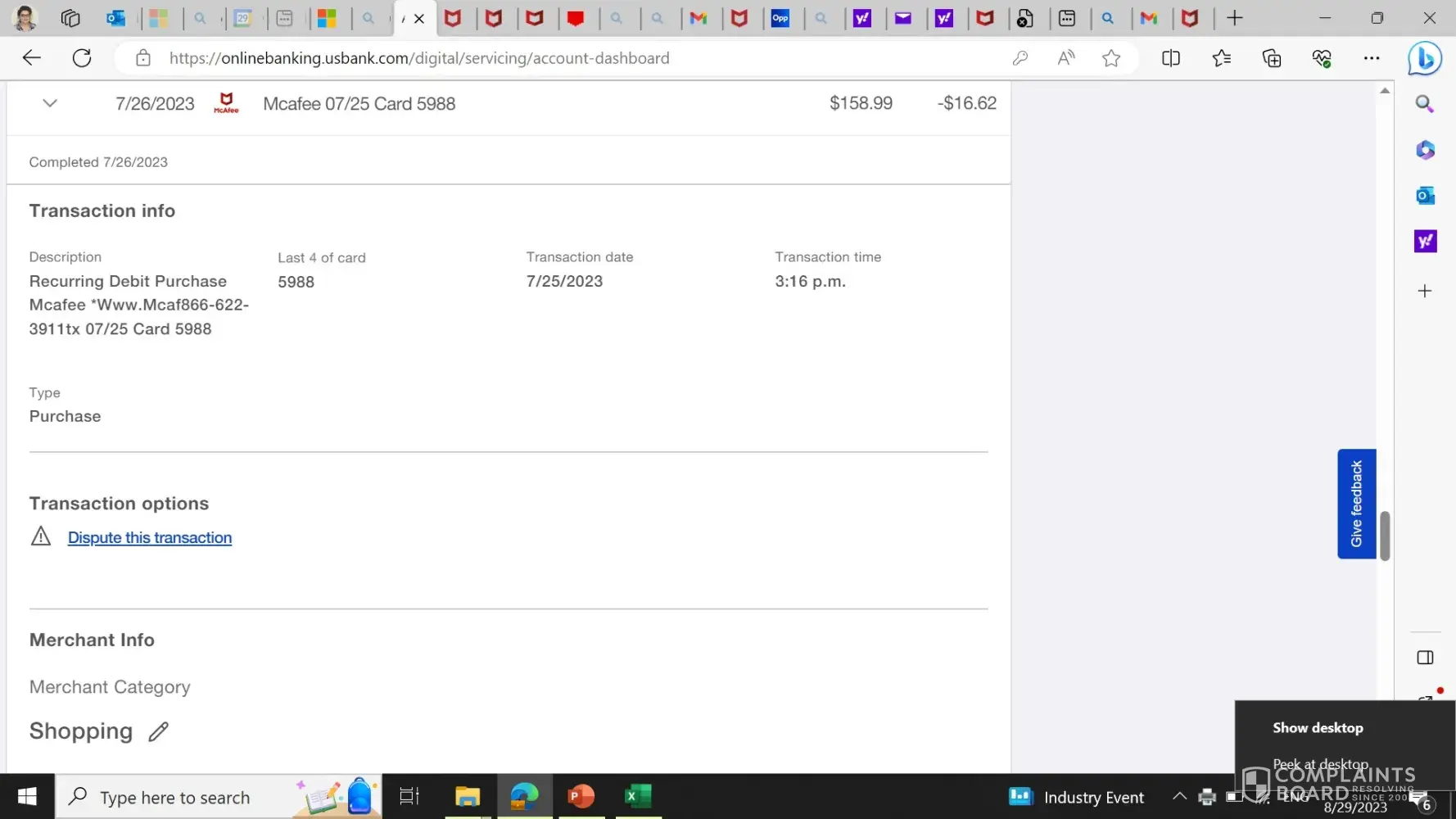 Here I am attaching the prt sc and file, in which is clearly seen that the sum was taken from my bank account. I called many times on the provided phone number, and McAfee customer service, talked with me, but they didn't do anything, to refund my money. I made a dispute via my bank - US bank. Th e bank contacted Mcafee and found that the money was taken by Mcafee. Still, I do not have my money back.