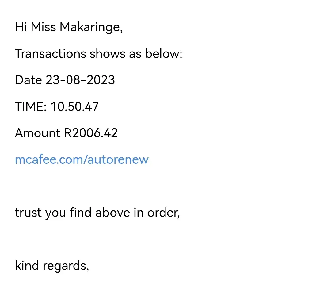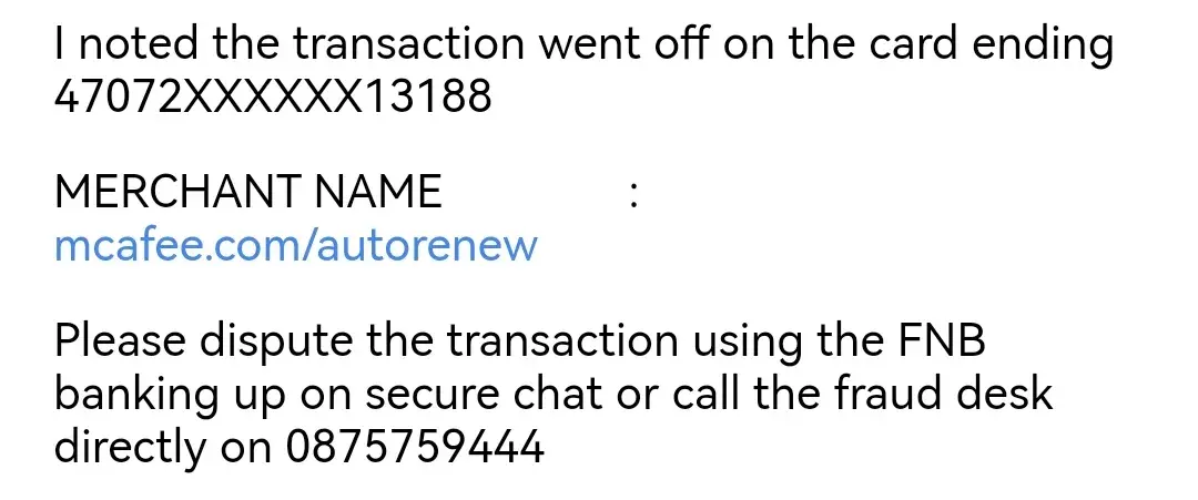 i got an First National Bank notification yesterday that R2006.42 with Mcafee.com/autorenew was debited in my account and i did not activated anything like that please help i want my money back as soon as possible Card No ending 3188 my email address mafanisa@gmail.com