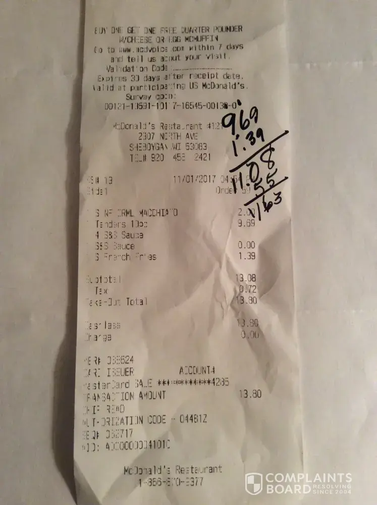 I was at our local McDonald's on North Ave. in Sheboygan WI at about 4:40 today November 1st. I ordered thru the drive up a 10 piece buttermilk tenders and fries. It was about $10 for the tenders which I'm guessing is the highest ticket item on the menu. Got home 5 minutes later and realized that the order had been sitting at the restaurant for quite awhile. Several of the pieces (or ends) were very very small. Looked like they were the end of a batch cooked earlier in the day and thrown in to make the count of ten pieces. The chicken was very grisly - most were inedible. I am so upset with paying that price for something so inferior in quality. Please make this right and refund my order for $11.63. The fries were awful too. The entire order appeared to be left overs.