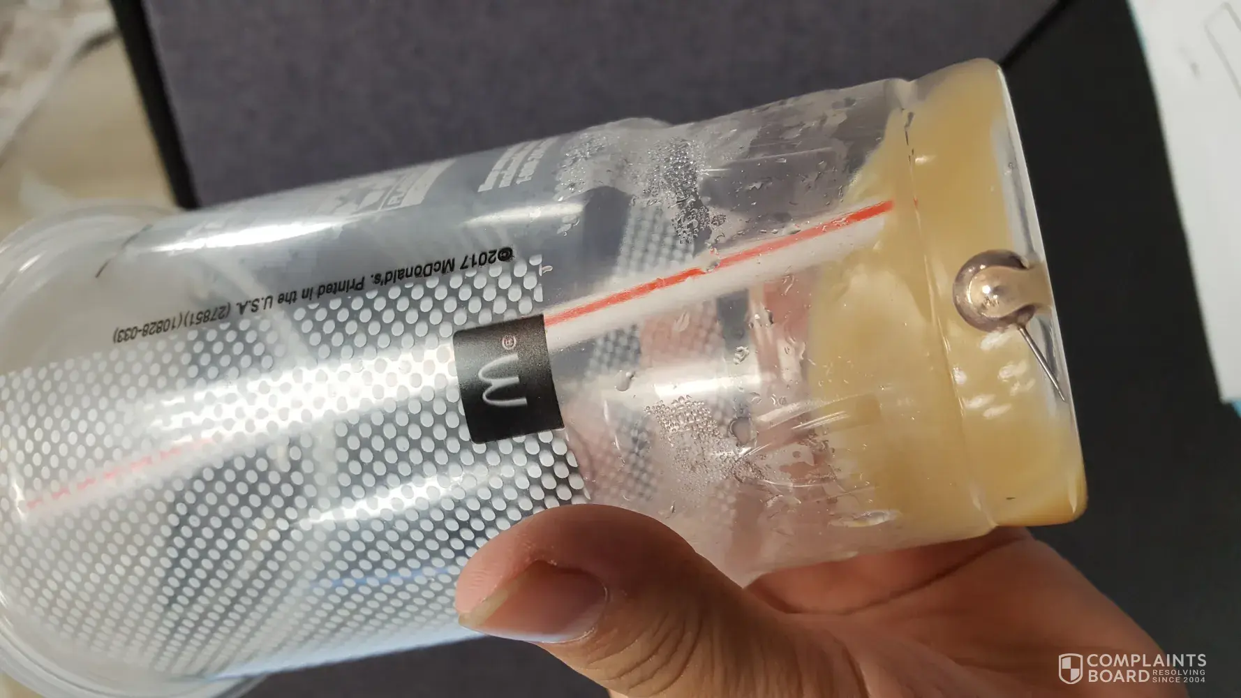 On November 3rd 2017 at 10:40 a.m. I went to McDonald's drive-thru in the city of Torrance store number 7411 address 19009 Hawthorne Boulevard Torrance California 90533. I order two egg sausage McMuffins and one iced coffee. And on my iced coffee there was a small earring I was drinking my coffee and almost choked on the earring. It was unsafe and I am upset.