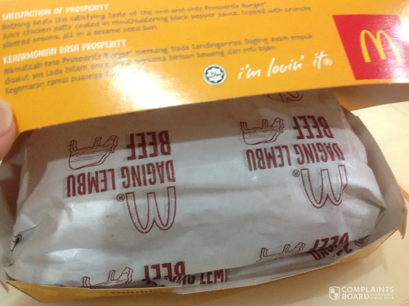 I called for mcdelivery and ordered chicken prosperity burger but the box wrote chicken prosperity burger but when I open it, the burger wrap with the cover wrote daging lembu beef... I cant eat beef in my religion! I need to consider it as beef or chicken? It is my lunch... I have nothing to eat now because I not dare to eat. It costs me rm11.95 gawdddd