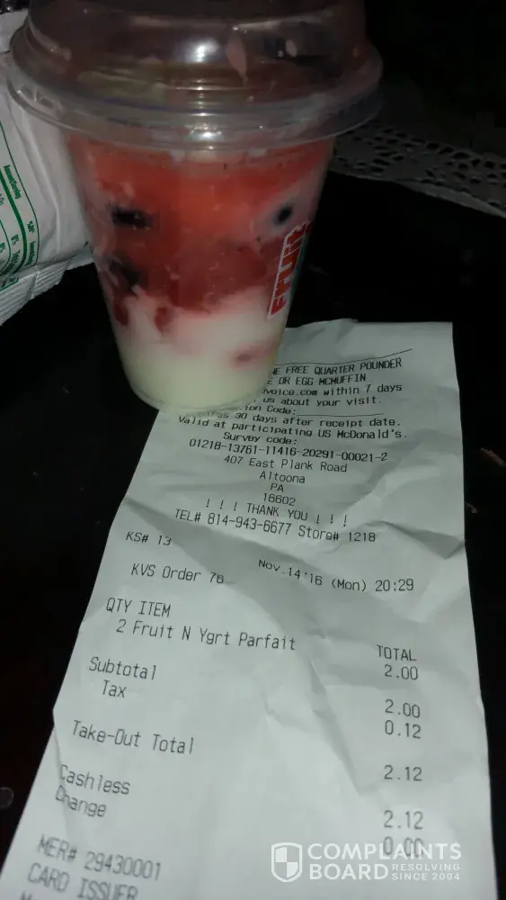 You can contact the McDonald's store for assistance. I recommend however always checking your food when you receive it when you are in the drive thru. The parfait in the picture does look normal to me however. Sometimes the yogurt can slightly separate.