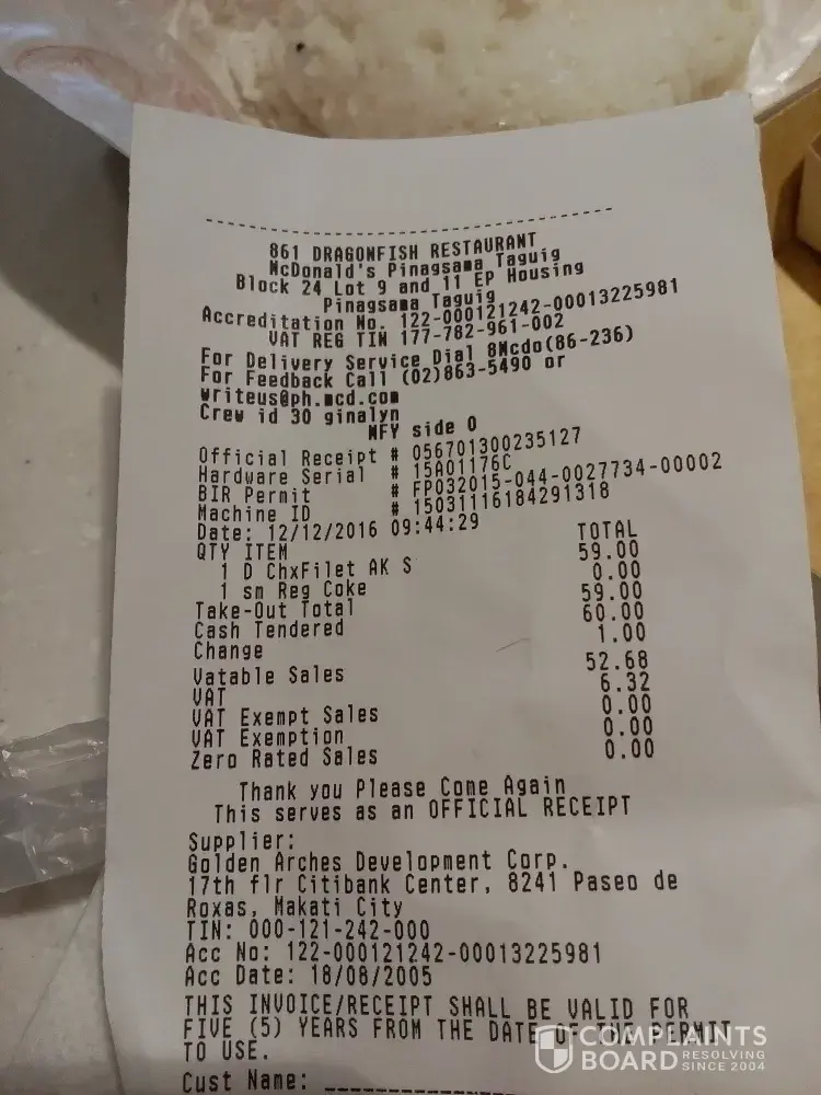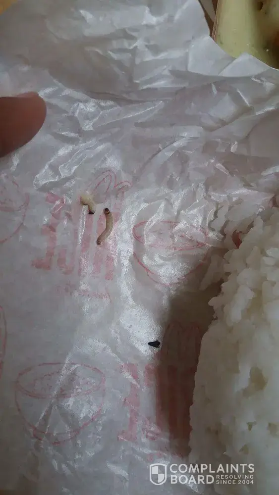 My niece just ordered a takeout chicken ala king at mcdonald's pinagsama taguig philippines because she was so hungry, when she reached home to eat she opened the rice found a 2 little worn and a skin of a little cockroach, who woukd want to eat that? We went back to that place and make a complain the mngr took the receipt and ask us to just replace it whatever we want, we said we just want a refund they did gave it to us and said they will just investigate it, but i heard he talk to the crew and told them to just throw it away, how would you investigate when you threw it...And he didn't ask us our phone to get back at us...