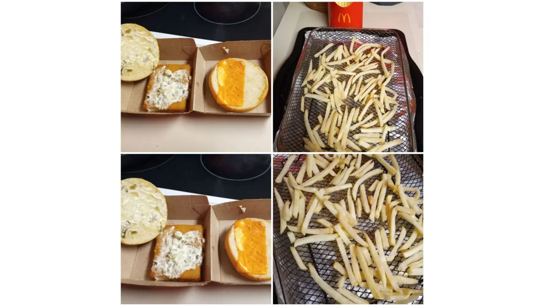 On April 20th we went to our Isaacs st McDonald's 2931 (Walla Walla Wa) I wasn't feeling well & I told my husband I could eat A filet o fish meal. I usually add more tartar & warm it in microwave When I proceeded to do that I found a 1/2 piece of cheese on my filet & My frys were Not golden brown & crunchy. They were Raw & white has to air fry them.