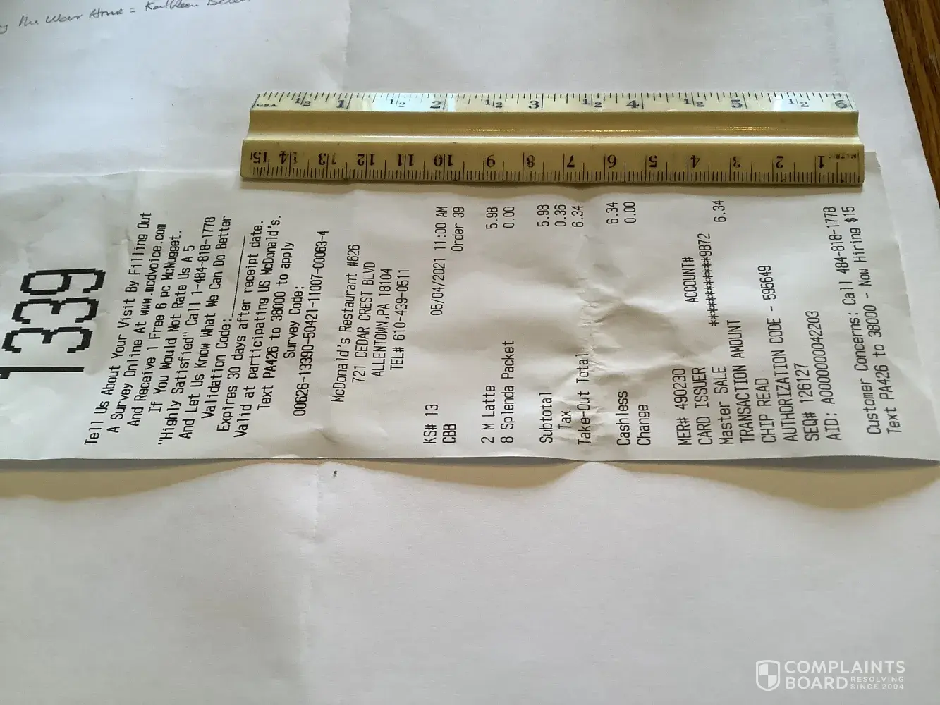 Today we purchased two hot lattes at McDonald's #626 at 721 Cedar Crest Boulevard, Allentown, PA. A copy of the receipt is attached. When we got home, my husband found a plastic part from the machine in his coffee. Photo attached. Could he have swallowed it? It is possible. If you want to get in touch with him, Juan Albornoz can be reached at [protected].