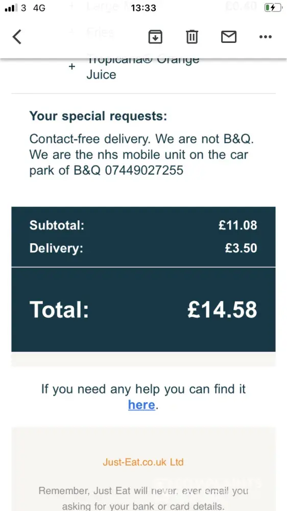 Order number 1050408759 on 26/10/20 ordered via just eat for Capitol Hill McDonald's. Order tracked 35 minutes but not delivered. McDonald's claim not their problem but just eats problem. Paid for 2 burgers. Claimed order delivered. Not happy Just eat have not refunded me and McDonald's have not refunded me.