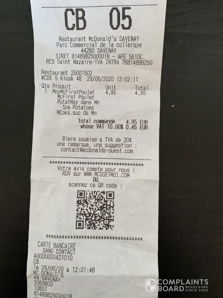 Today the 29/06/2020 I visited the Savenay restaurant number 25001502 and ordered a Mc First Poulet menu price 4.95 euros CB05 at 12:02:11 paid by card.