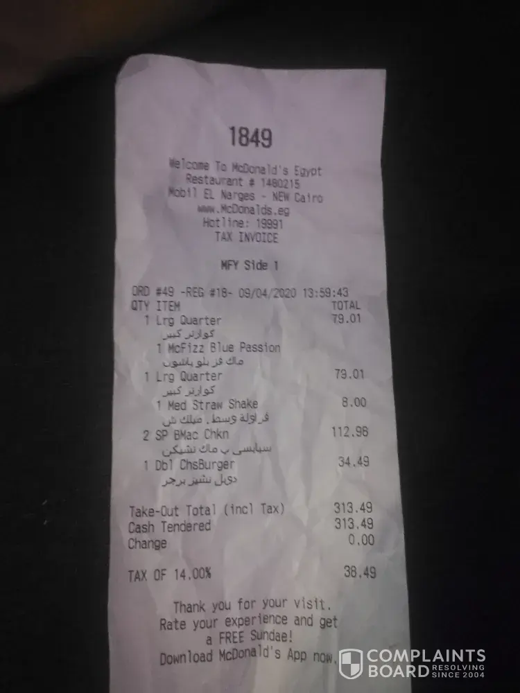 I ordered the following items from the Mobil El Narges drive thru branch, New cairo, Egypt at 13:59 with order number: 1849, branch number: 1480215