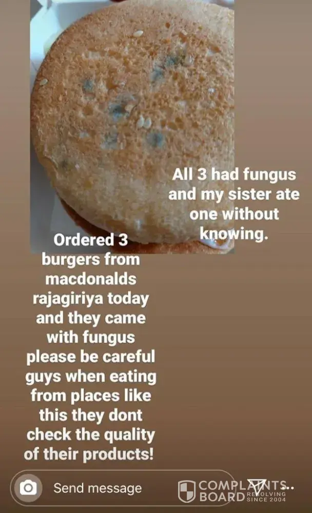 I ordered two meals from the McDonalds Sri Lanka, Mount La Vinia branch yesterday the 14th of April, 2020 and was horrified to find fungus at the bottom of my bun and green fries! I called and asked them to send me a fresh batch, to check their expiry dates and make sure this doesn't happen again and they had the audacity to send me more rotten burgers trying to deceive me by picking out the fungus off the buns leaving holes and remnants of fungus. They didn't even care for my complaint! When I called them back, and requested to speak to the branch manager, an HR manager called me back, told me they do not know what I am talking about because they check their food and this has never happened before. When in fact, the only reason I flipped over my burger and check is because my friend advised me to do so the minute she saw a snap I sent her of me getting ready to eat! They offered me a free meal as a sorry but I was so horrified after this incident even after being a loyal customer who spends 50% of her salary on McDonalds! It's clear that the franchise owners