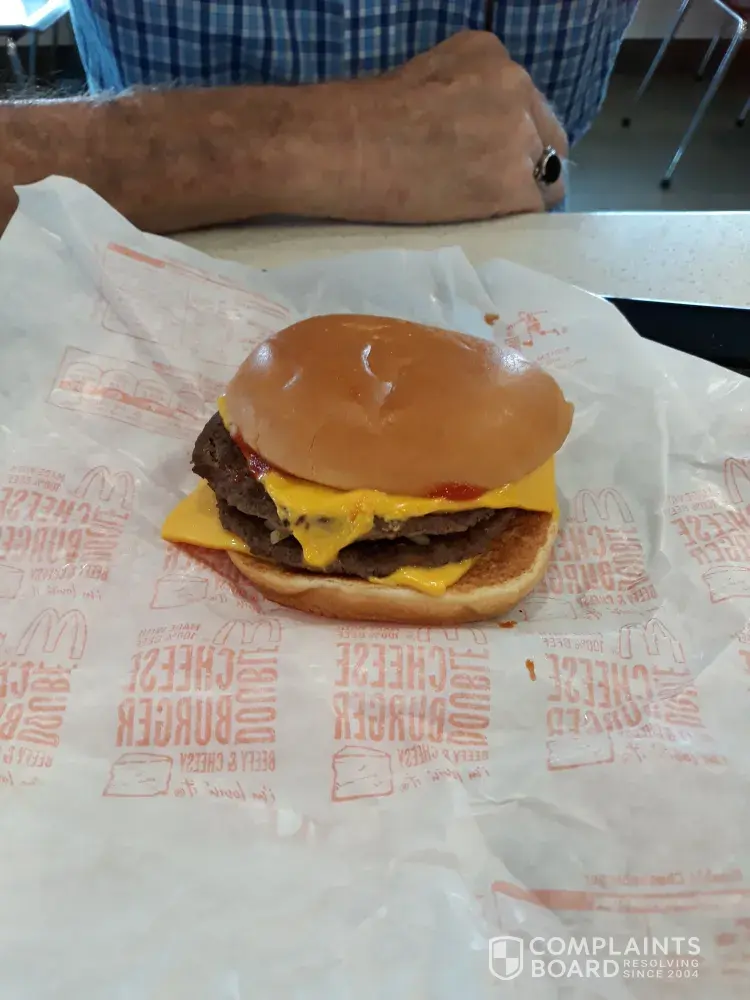 The advertisement on television shows a large Double Cheeseburger, almost too big to take a bite from. When the burger arrived, it was so tiny, that a 2 year old child could have eaten it. The burger wasn't even even either, the top bun was almost off the rest of the burger. It was also dripping with fat. We were absolutely disgusted with your product. The buns were so small, and lettuce was limp! My pancakes were delicious, however my coffee was just warm, and as always, I specifically ask for "extra hot". This is so disappointing, as we love McCafe' coffee.