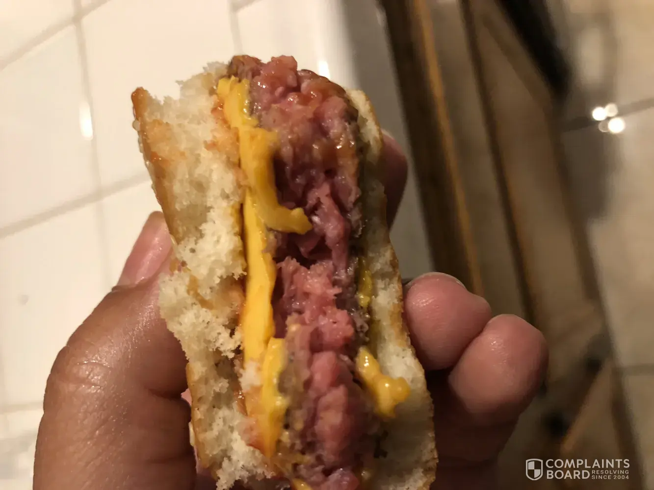 Meat was not fully cooked on burger it was pink inside like RARE! ... managers should properly train new employees and make sure food is cooked correctly. Me n my family had a long day out at the beach get home ready to eat pass by grab sum mcdonalds ordered quarter pounder with cheese only n my daughter ate half a burger this can cause illnesses n harm anybody i tried callin restaurant twice but no one picked up to let them know of incident n prevent from happening again. We will no longer be goin to that mcdonalds ever again and i will from this moment forward cut burgers in half to make sure my kids can eat them before i assume they are well cooked.
