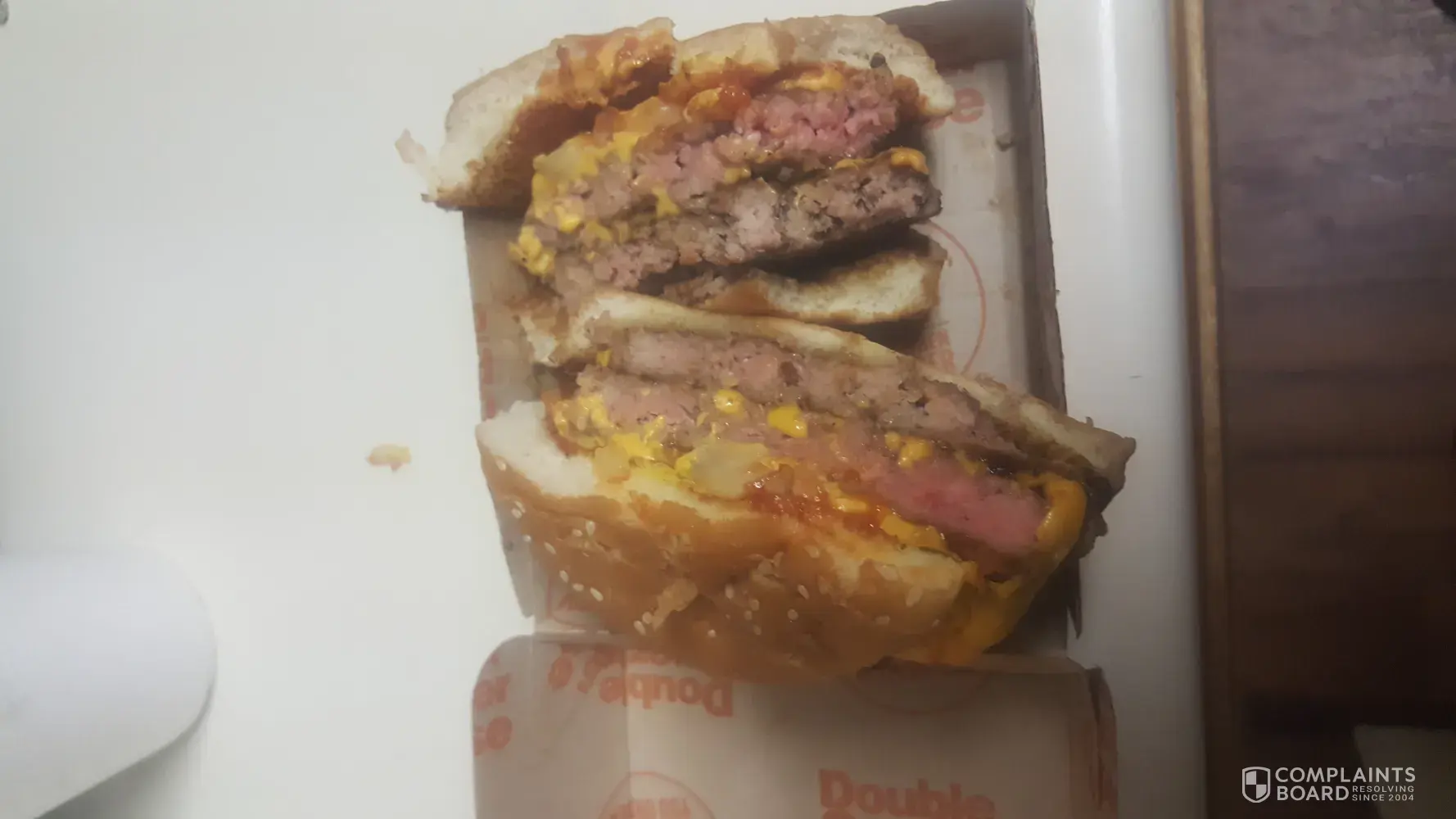I went to the drive thru at McDonalds on South Roxboro Street in Durham N.C. I ordered 2 double quarter pounders with cheese. When I got home I took a bite and noticed the burger was bright pink inside (not done). I took it back to the restaurant and the cashier said she would replace the burgers. After she gave me two more burgers I could not eat them because of being nauseated thinking about the first two burgers that were not cooked done. I also saw online more complaints from other customers of burgers not being cooked done. This does not seem to be an isolated incident and I feel the employee need more training on how to cook the food properly.