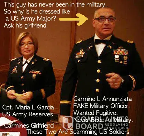 Cpt. Maria Garcia has passed away. The disgusting mental case who took advantage of her Carmine L Annunziata is scamming soldiers at JBUEC 527 Sykesville Rd. Wrightstown, NJ. This faker wore the uniform of a Army Maj. and he never served one day in the military.