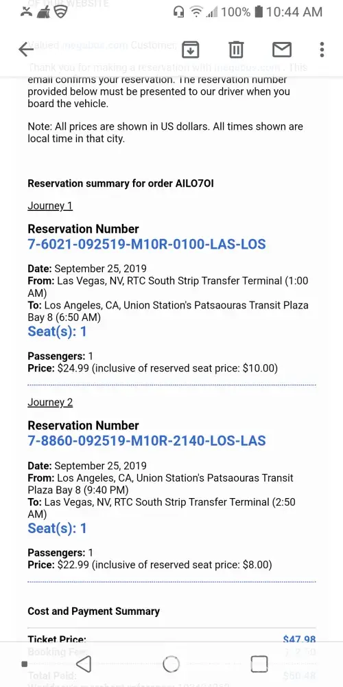 On Thursday 8/1/2019 I purchased 2 one way tickets at $51.98 with reserved seating in handicap seating. The Departure time for travel from Riverside, CA to be 10:40 pm to arrive in Las Vegas at 2:50 am on 8/2/2019.