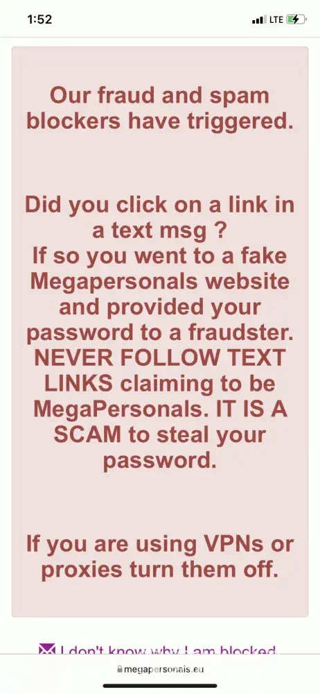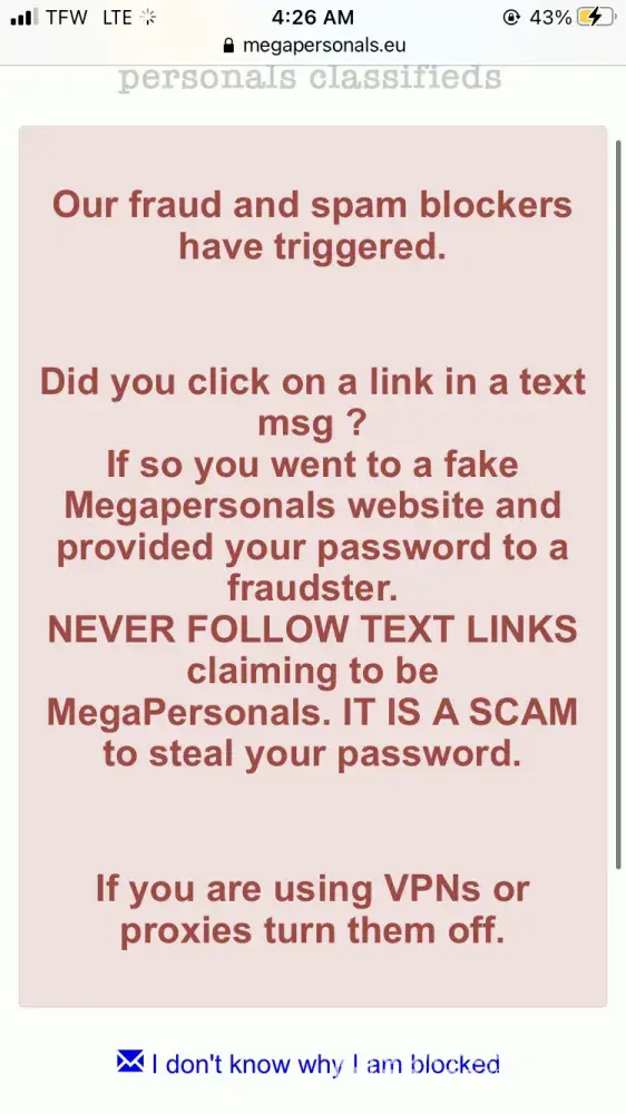 Falsely blocked. B4 I meet with ppl I screen them and verify them. I was contacted by a person and I asked them to verify and asked them my screening questions and they got all hostile and told them When I asked other ppl my screening questions They don't hesitate to tell me what they are. but he had an issue with it. So I told him well I don't feel comfortable with meeting you have a good night sir and hung up the phone not even two minutes later I'm bumping up my ad, And then the screen pops up with " Our fraud and spam
