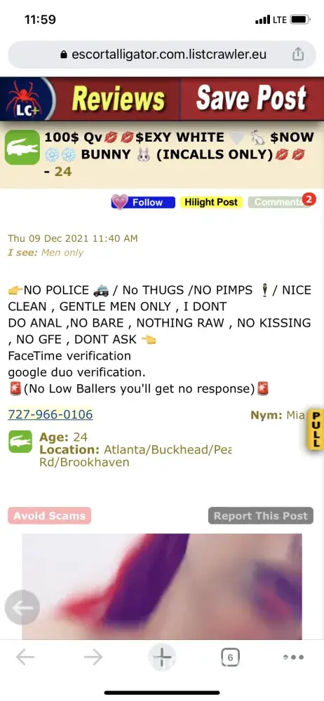 The phone number given above belongs to an account, I responded to, once I arrived I was told to send a deposit. Once I sent the deposit I got no response. After 30 minutes of me waiting I received location. I went to the location and the pics were not the same person. Also I was held at gunpoint and ran for my life. This is a dangerous ad please remove for the safety of me and others