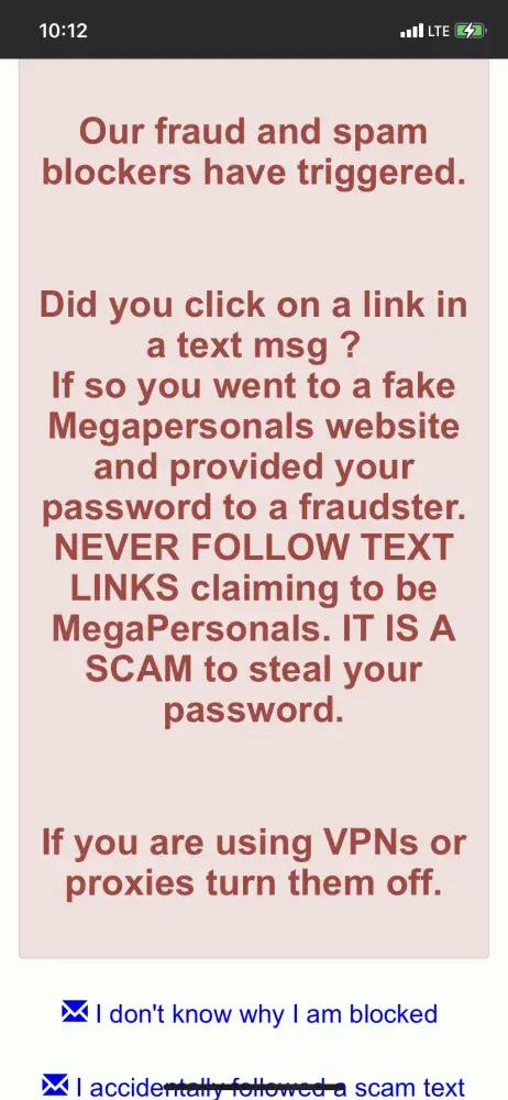 I have ben using mega personal's for like 2 years and then these scammers somehow hacked my account even though I did not click on any link or any of their [censored] text messages to verify but they still got hold of my account and when I reported it all of my accounts are now flagged for spam but these scammers are somehow still using my account information that's amazing so I have been locked out for a couple weeks and i've been doing some research and for anyone out there who having the same problems I am which were gonna have to do is change your ip address figure out how to do it on your phone either changing to static or doing it through wi fi or thru your carrier because that's what's going to work I used my old phone that I no longer have network on and I connected to the wi-fi where I am and I was able to post but megan personal still needs to fix this problem