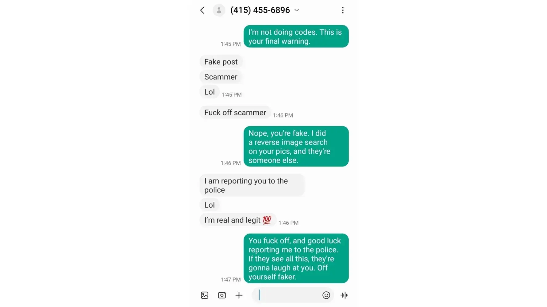 Ever since I joined the site, a lot of people have contacted me, claiming to have seen my ads, but want me to text them codes to "verify myself" to prove I'm real. I've had one person texting me, wanting me to send a code, so I refused. She then called me a fake, a scammer, and threatened to report me to the police. Seriously, this is ridiculous. I didn't joined the site to deal with scammers. I have screenshots as evidence of the scammers that have been bothering me for months. I tried telling them that normally people don't text codes for anything. Obviously they just don't get it. If they can't tell that I'm real or not, then there's something wrong with them. I hate it when people pull this crap.