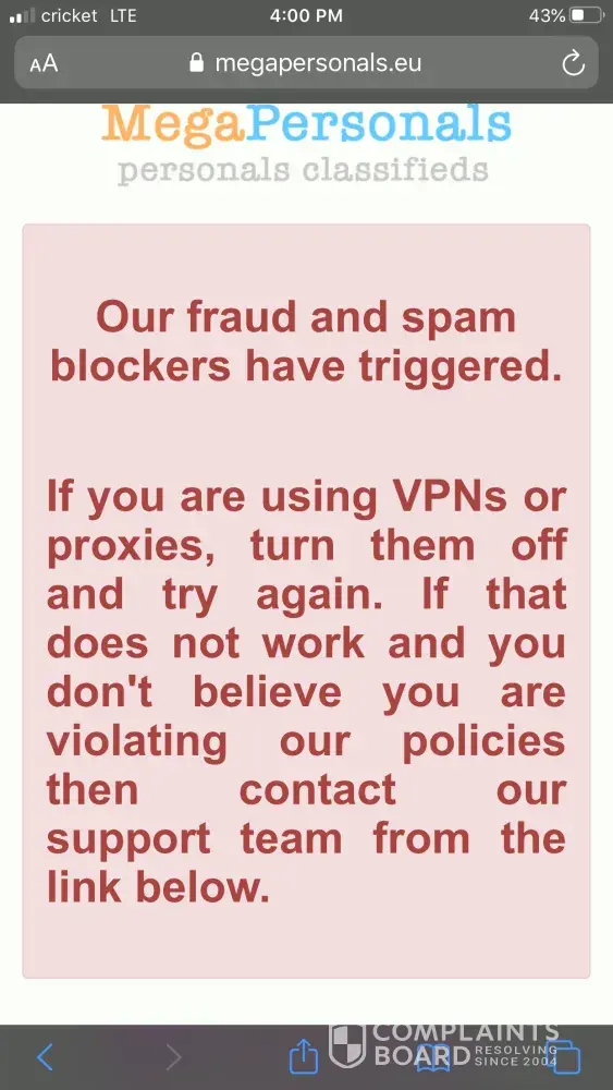 My mega personals account has been blocked and I've sent numerous messages but I never get a response