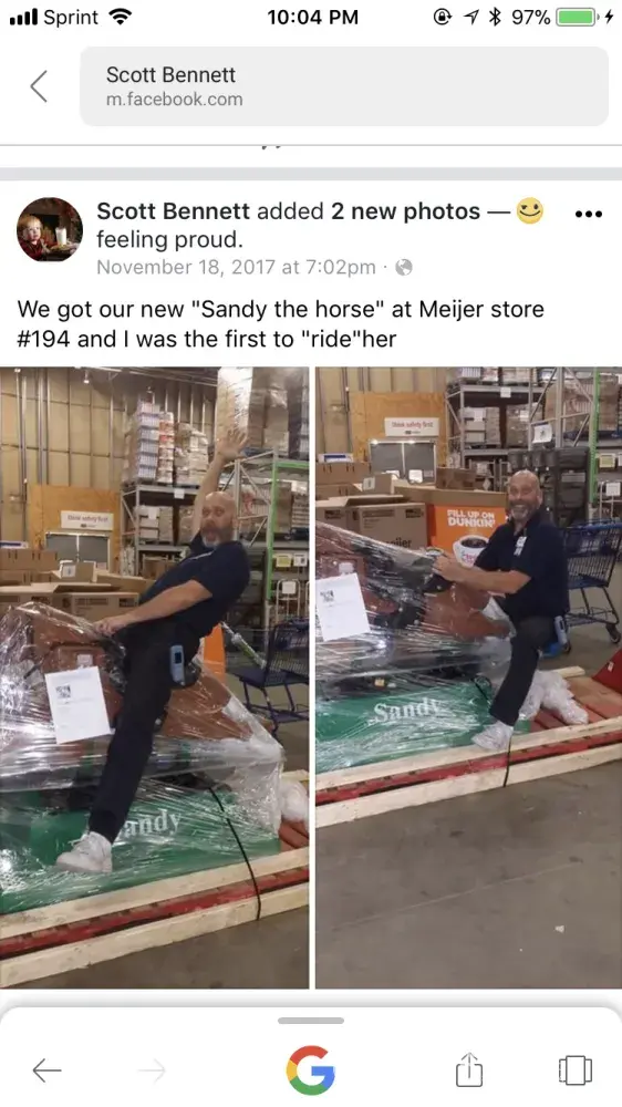 Found this photo on Facebook of an employee of store 194 Charlotte Mi saying and posing with Sandy the horse. It sickens me to think that this goes on at the store then gets posted on social media! Absolutely disgusting Employees should be held accountable for their actions. This employees name is Scott he should be reprimanded for this type of behavior and having it posted for all to see