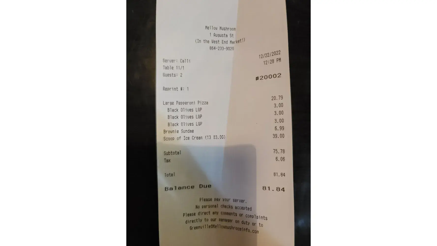 Visited MM in downtown Greenville S.C. on 12/22/22 at 11am. We are regular customers and always order the same thing so never need a menu. We visit several times a month and always get a large pepperoni pizza with extra black olives. My friend usually gets a brownie sundae for dessert and I will occasionally get just a small bowl of ice cream. Our bill is typically in the $38-44 range consistently. He will ask for an extra bowl of ice cream with his brownie sundae. This time our bill was almost $82! We inquired about it and the server told us that the manager told her to charge $3 for every scoop of ice cream they gave us. The sundae and two additional bowls of ice cream was over $39. The manager caught us on the way out and said they recently had a price increase and the menu states that its $3 a scoop, which it does not. We said we would be contacting corporate to complain and she said that's ok, it all has to come back through her anyway. We also said we will not be returning and will be telling all of our friends about it and asking them not to go as well. I have been a regular customer for over 25 years because I prefer the pizza over any other place. But after being blindsided like this and treated this way I will not return myself. No apology or offer to may it right was ever offered. I have never seen this manager either myself. Not good customer service at all!