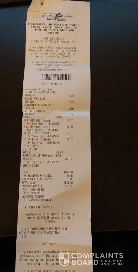On Nov. 6, 2021 I brought my new refrigerator from Menards Store #3333