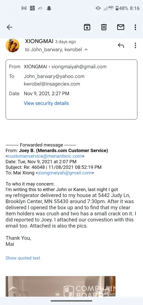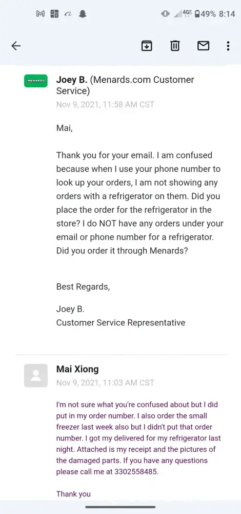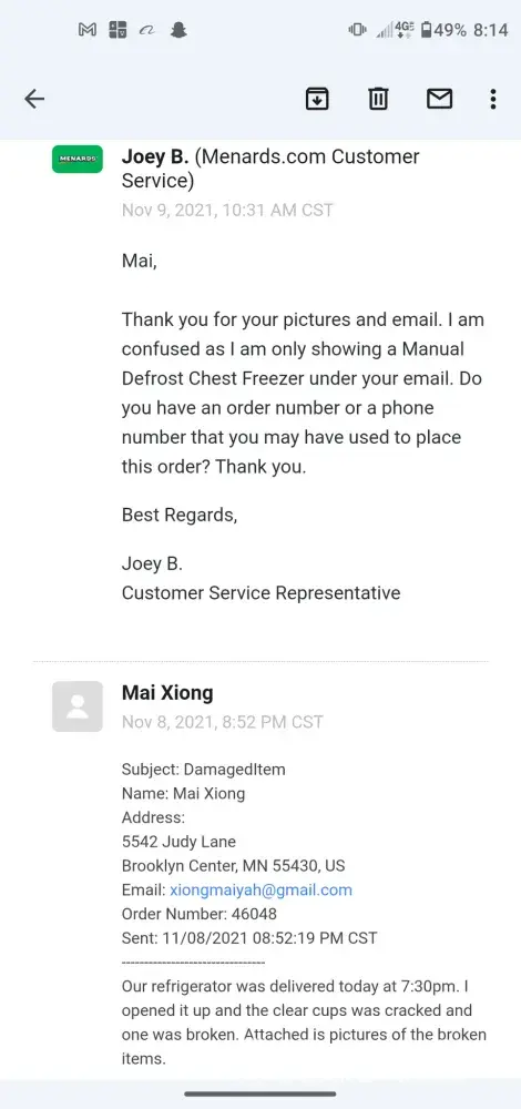 address is 7800 Lakeland Avenue North, Brooklyn Park, MN [protected] Phone number is [protected]. My delivery date was Monday 7th, 2021. When I got my refrigerator at 7:30PM and to find out that my clear item holders was crack and broken. I called customer services and they told me to contacted Menards online under "damaged Items". Attached is the email I file for damage goods and Joey reply back to me that he won't able to help me due because I brought at the store. So he has no access to looked up my number. I then contacted the delivery service on my Delivery Agreement and turned out that no one has respond back to me. I'm upset because I'm spending alot of money on my refrigerator and to find out it was damage and no ones wanted to helped me with it. All I want was just to replace the damage items. Attached is all the conversations and invoice.