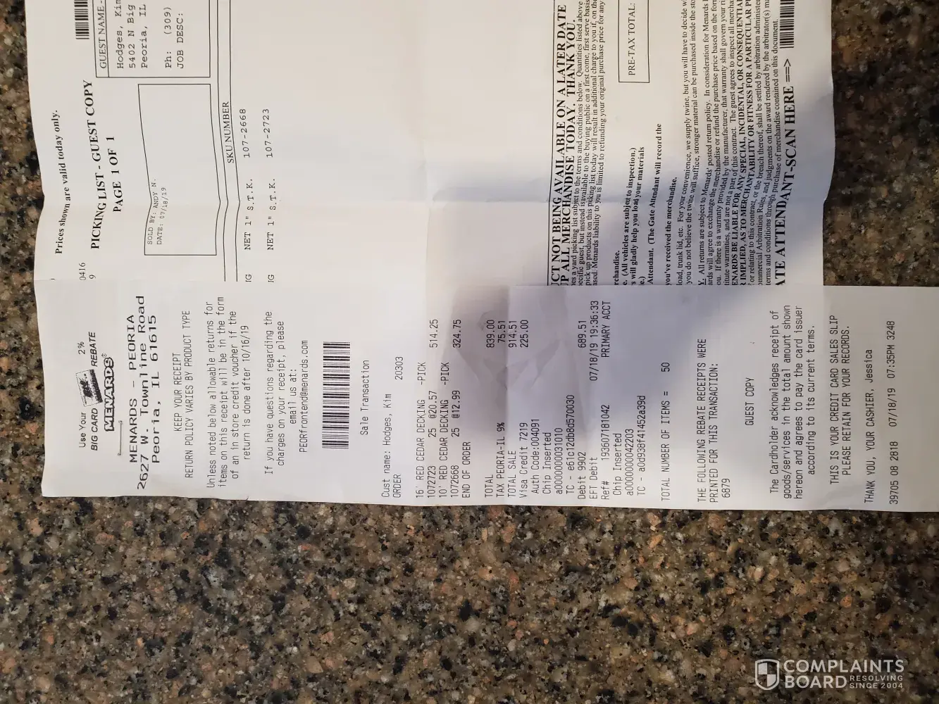 I recently purchased (25) 5 3/4 ×6×10 and (25) 5 3/4 ×6x16 cedar wood decking on 7/18/19 at your 2627 W Townline Rd location in Peoria Il. I've attached copy of receipt for your convenience. My husband and I went to this location on Monday July 26, 2019 to retrieve lumber. When we entered the lumber area we ask for one of the employees to help us place lumber into van. Half way through the 16' we noticed the wood was used and some were damaged (cut). He continued to put wood in van (wood that was good) and we left. Note: Day we picked up lumber we also purchased (12) 2x8x12 wood and decking nails. In total we spent well over $1, 000.