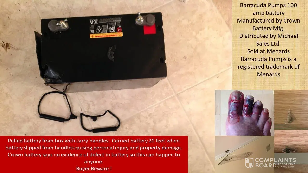 Purchased a Barracuda Pumps 100 amp battery from Menards September 5, 2018. Lifted battery from shipping box with carry handles, observed both handles in grooves, carried battery 20 feet when battery separated from carry handles. The battery fell on my foot crushing thee toes breaking bones in each before tumbling down a flight of hardwood stairs damaging several steps, denting wall, and finally crashing on the tile floor in the basement. Contacted Michael Sales Ltd and Crown battery for reparations, after several weeks was told Crown cannot confirm any defect with the battery. This means that just by using the carry handles advertised on the box you can be injured or have property damage. I strongly recommend that Menards investigate the safety of the products they sell.