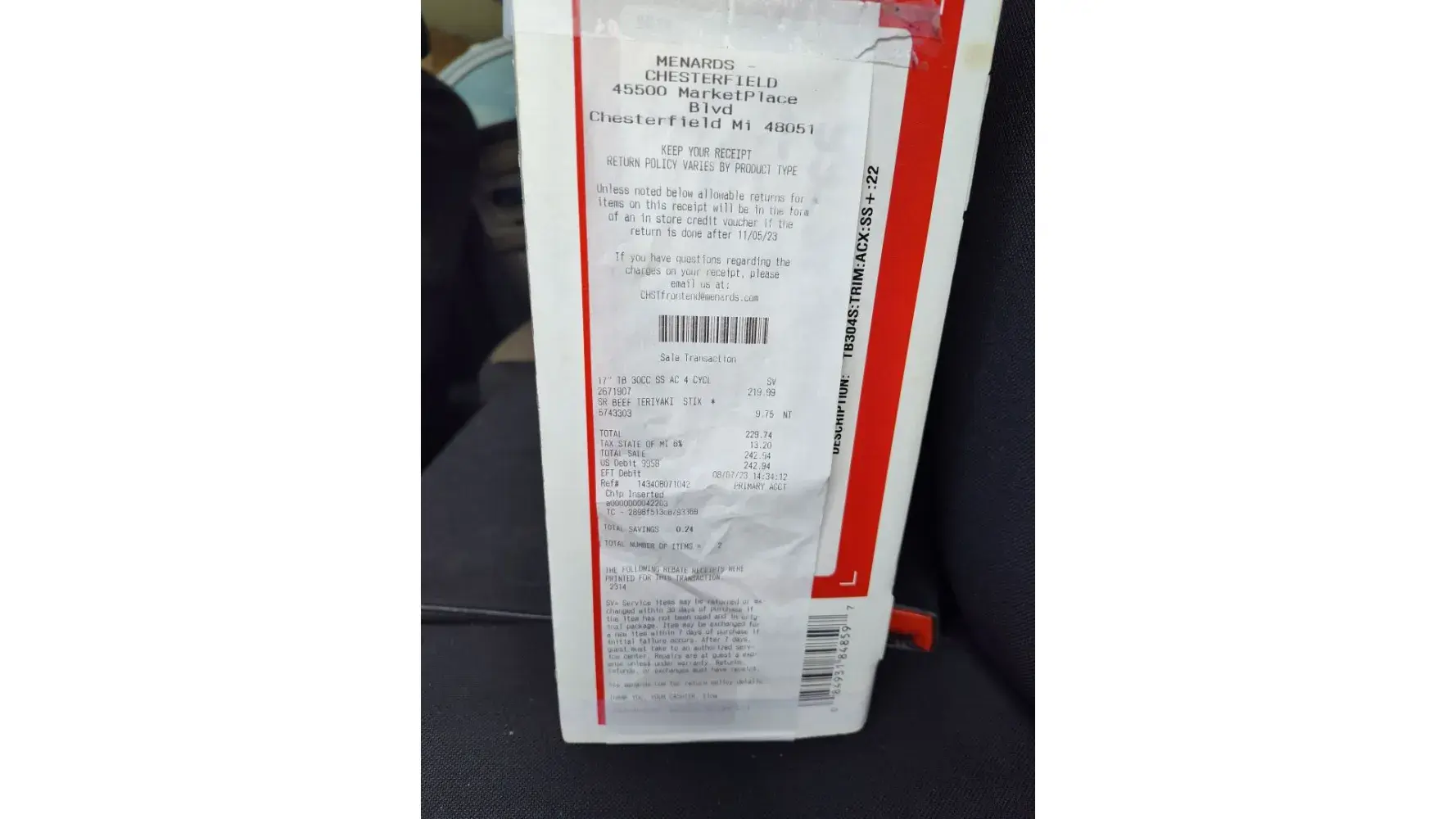 I exited the store with no results. Was standing outside of the store with the weed whip in a shopping cart, and a gentleman coming in the store seen the weed whip and ask me how I like it. I told him I didn't, and that Menard refused to give me refund or store credit for it.