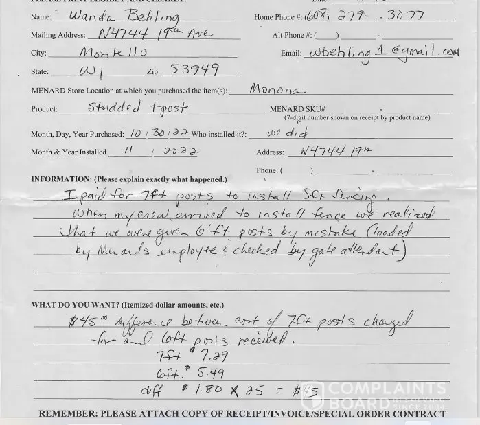 Desired outcome: What I would like from all this is some sort of compensation to cover the extra fees I incurred and an apology from Menards for not really caring about their customers