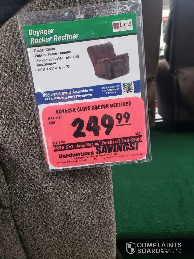 We went into the Bolingbrook IL store to look at recliners and found one we liked. The price was 249.99 and had a free area rug with purchase. When we went to pay for it we were told we had to spend 299.99. The price tag specifically said free are rug with furniture purchase and didn't say anything about a minimum dollar amount. The store manager STEVE SMITH refused to honor the price/items advertised so we left without purchasing anything. In addition when I called the customer service complaint line I was told I had to submit the complaint in writing. They just hope you don't follow up. Not only am I following up but I'm registering a complaint with the Illinois Attorney General. Good thing we took a picture of the price tag with a time stamp.