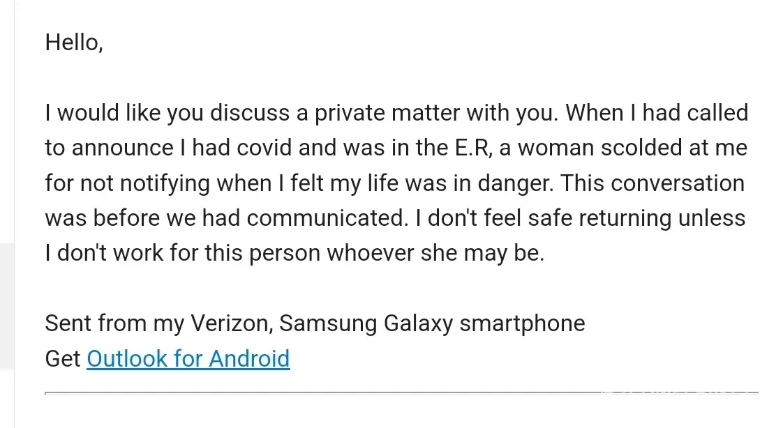 Desired outcome: I'd like an apology and please give me money for covid leave.