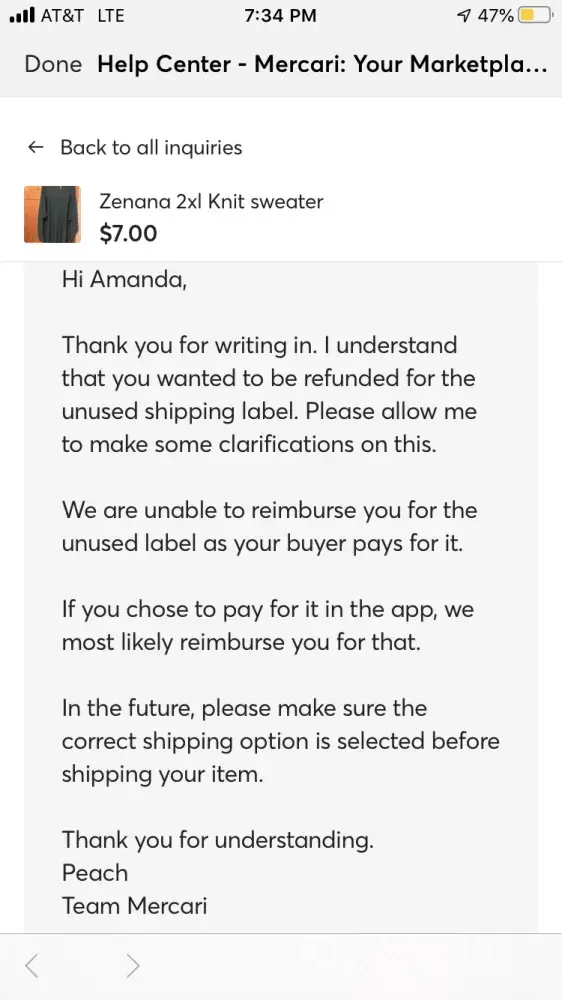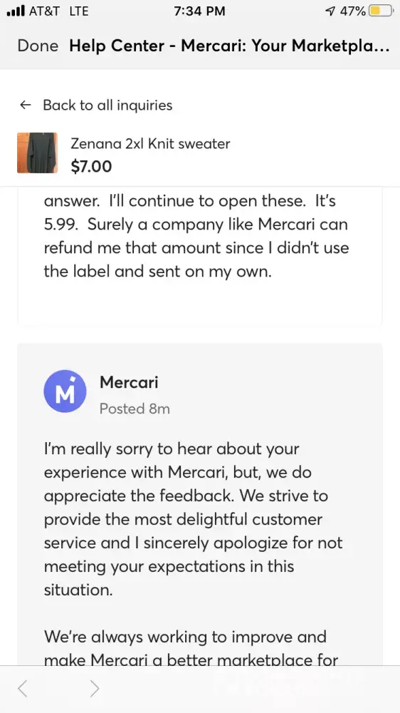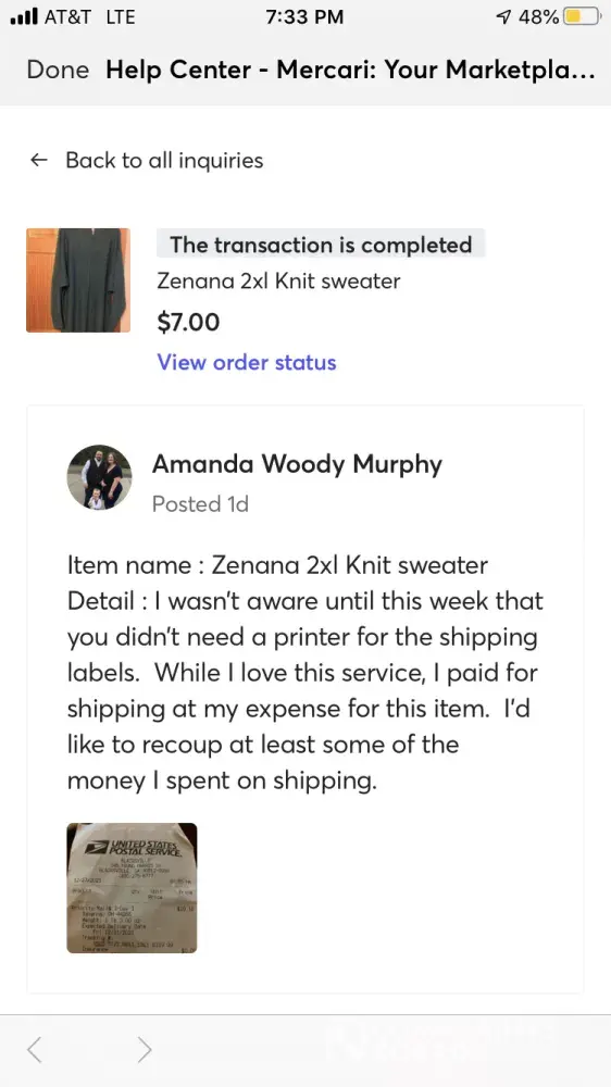Desired outcome: Mercari reimbursed me for my product.