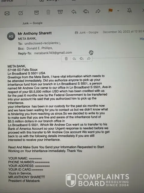 Greetings from the Meta Bank, I have vital information which needs to be attended immediately. Did you authorize anyone to pick up your inheritance fund from our branch in Ln Broadband S 5501, a person named Mr Andrew Cox came to our office in Ln Broadband S 5501, Ave-in respect of your $5.5,000 million USD which has been credited with us for the past 6 months now by the Federal Government to be transferred into your account He said that you authorized him to pick up the Inheritance. your inheritance has been in our custody for the past six months now and we have been waiting for you to contact us but we didn't know what is hindering you from reaching us since.So we decided to write to you to make sure that you are fine and aware of the inheritance fund of $5.5 million dollars in our branch office in Ln Broadband S 5501, Which Mr Andrew Cox want us to transfer to his Bank of America Account so your Urgent response is needed before we proceed with this transfer to Mr Andrew Cox account We want you to get back to us with the following details immediately if you are still interested to receive your inheritance. Read And Make Sure You Send your Information Requested to Start Working on Your Inheritance immediately. Thank You