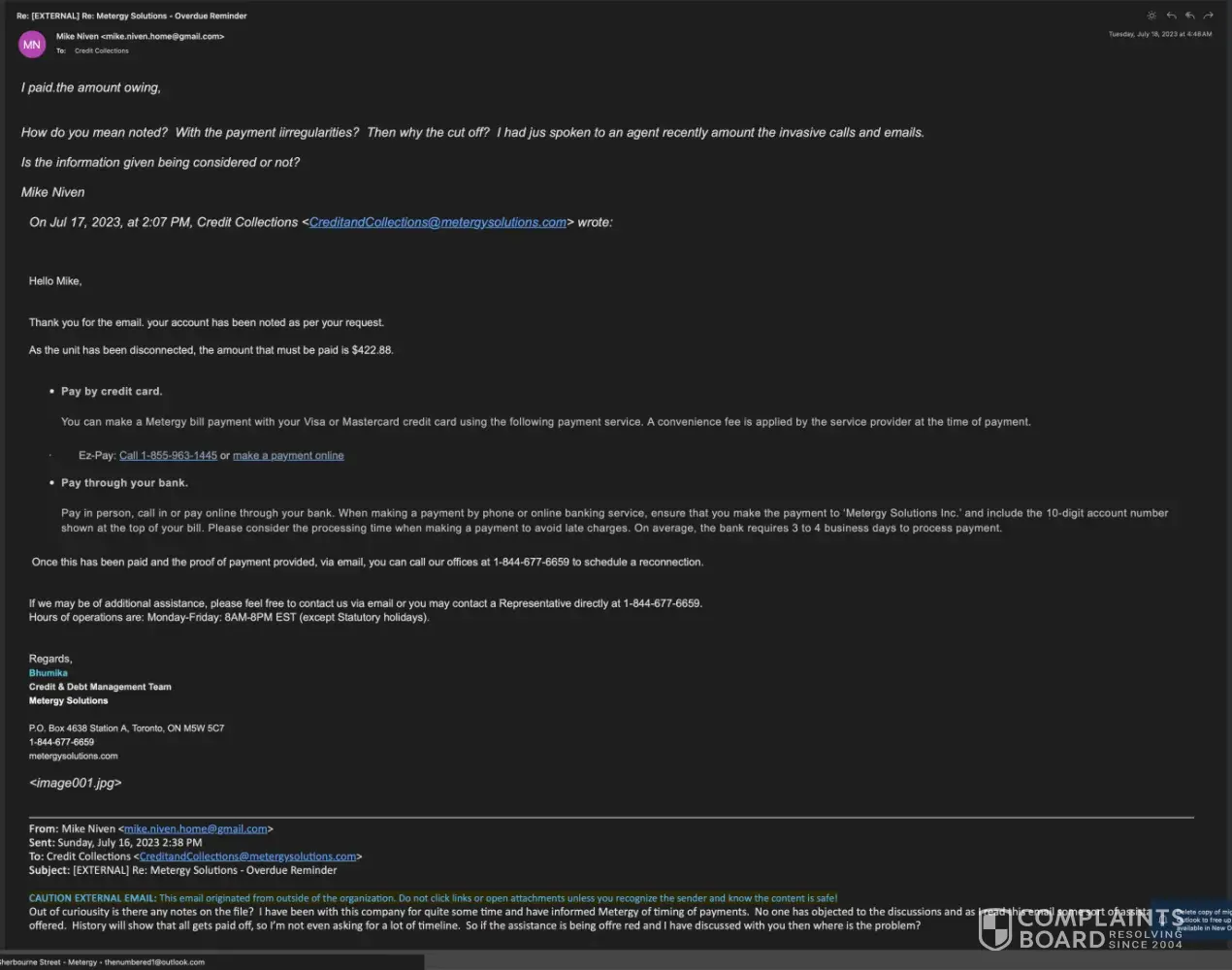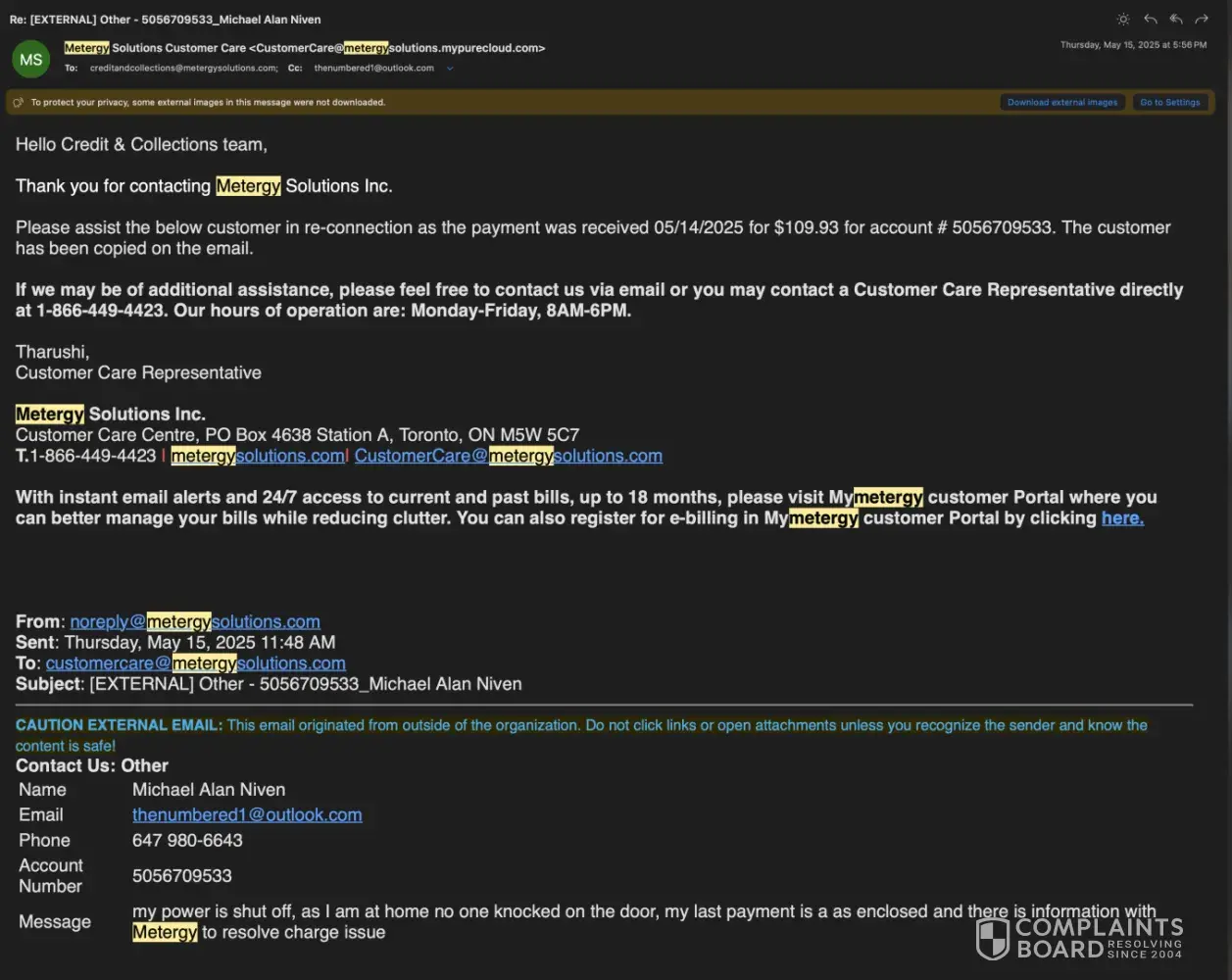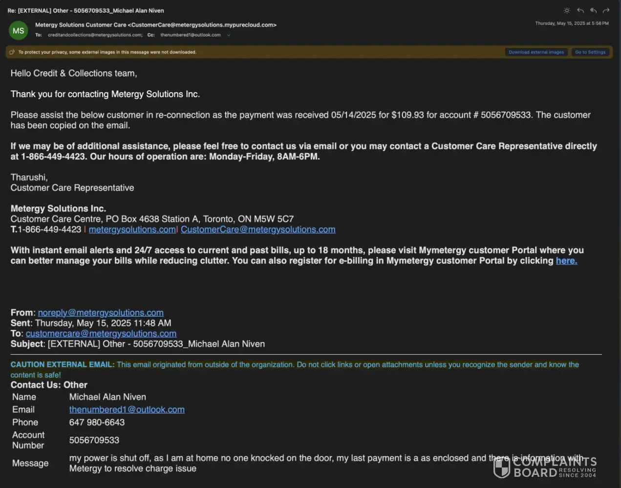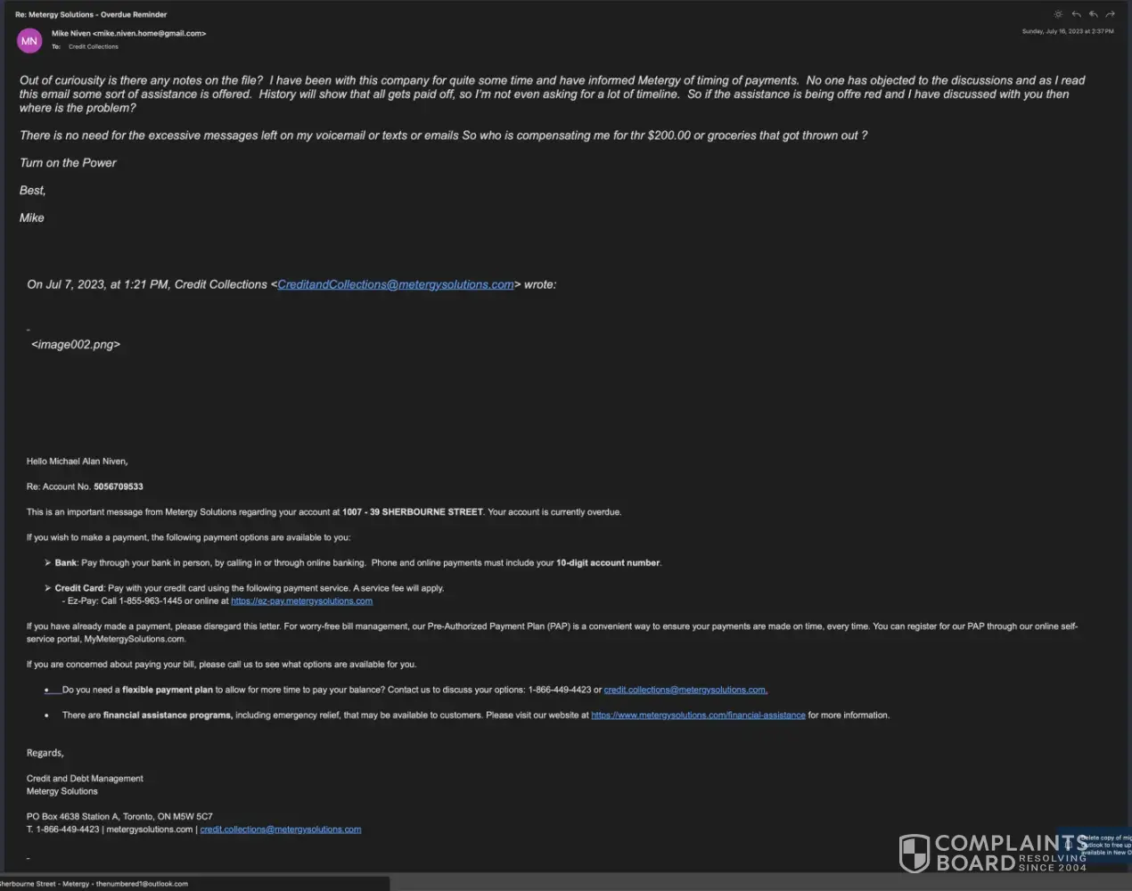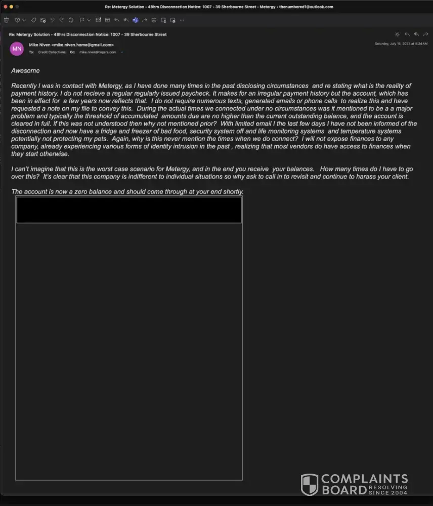 Metergy is the contracted service for our condo building. End of April i was in fact sent a 2 week disconnection notice, the sole venue used for these types of notices as per their polices is by mail. They sent it to the wrong address. Portal allows for a mailing address and they used the service address which i do not check often. it is essentially closed for too much junk mail distributed in the area. With no clue there was an issue and as i was current in my payments. On May 13th this year was sent a 2 day notice, by email, I received it at 3pm, missed it but had prepared payment on May 14th in the evening. on May 15th my unit was disconnected about 5 hours before the expiration of the 48 hour notice.The notice says nothing about disconnection and to make contact before 6pm that day, which I did by email. it is typcial to have to wait if you phone, so sent an email about the power and that a payment was sent the day before sent the receipts as well, nothing. Friday. i received and answer to the email from customer service tthat the payment was made on the 14th, and to assist me in setting up the account, this was on Friday at 6pm, so not power for the weekend. the current invoice was not due until the 29the but there was a carried non payment for when they did the same thing last summer, I have tried to talk to them about it, sent my back up, no reponse. I come back to this. I had tried several times to call in, every time there was a long cue and every time took the option for a callback but never got one. Was communicating through email and customer care continuslaly asking about reconnection and informing them that the errors of not following their policies is the reason for the cut off. it was on day 14 that an email sent and a human called back and put me through to credit to schedule a reconnection. First woman hung up on me, more confused than anything as she put me on hold then hung up. She did confirm that the portal was down completely as i was trying to determine the may 29th payment for any balances, 14th, 23rd and 31st. payments were sent, and ended up overpaying the account which they deducted a disconnection fee, because they cut it too early. have already argued the point and was working with OEB, they never ask for back up. The after i set up reconnection, OEB reaches out that it is resolved and the connection is set up, and suggests i apply for financial assistance. So this time they sent me a notice to the wrong documented address, cut off power after a payment was made, and the agent that turned off the meter never came to my door, and i know this as i was workng in my office beside the entry.and dont follow the information on teh 48 hours notice at all, which i did. Throughout the 14 days agents would come back with points listed in policies that justified the disconnection, like the notice was sent but to the wrong address. Their involvement at each stage seemed more about invoicing a charge than helping get reonnected, so for that time basically had no. power, no lights, was charging battery packs constantly etc.. for 14 days. For the disonnection they claim, there was not info on the charge, and a weird amount on my profile, which only started to wokk but payment history was missing and a credit note. Without my knowlecge they just kept the extra funds and put through the first have of the charge. Last June or july same thing happened, they sent me a notice then a 48 hours notice and as i was way disconnected the power. Why this occured is that being self employed, my checks are irregular, so I phone them to tell them about it and i may miss some due dates, and I did. They told me that they noted my account, once verbally and twice in writing yet there were never any notes on the matter. When the became extremely aggressive, 13 texts in one week, I call in to find out there is not notes, even asked to see my file to verify what s on the file. ignored. this incident was so grossly misleading , they caught a time to issue the disconnection ..I was working with OEB, end expected the charge to show up on teh next invoice, but the response OEB was lame and not well investigated, basically receiving Metergy s version and going with that, and both times e i had back up. which they didn't want. I told OEB that my extra check was confiscated, and inquired if they were ending at their resolution or do they continue with the complaint. No answer. Essentially this is a monopoly and they have a contract which they made with the developer and we are stuck with this company until next year, they own the meters as well. so i guess they think they can do what they want. As per their policies, I did not break any of them, while they didnt adhere to them. i might just move.