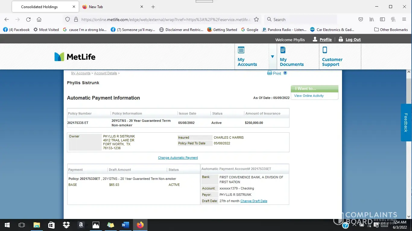 I have not gotten a response regarding the draft for my son who is insured and I the policy owner. I recently inquired on line as to why a transaction hasn't been sent for the new premium amount of 72.25 for May. A new automatic draft form Electric Payment (EP) Account Agreement was submitted by fax 4-28-22 after the help of a customer service representative by phone who assisted me with filling out the information. I indicated that the date for this is to be the 27th of each month. According to the Automatic Payment Information attached the base is 65.03. The bank information is correct and it states the status is active showing policy 202175335ET is paid to 5-8-22. Nothing has come through my account ending in 1379. I also am registered on line metlife.com where I can log into the account and I'm having difficulties on the website 6-5-22 and 6-6-22 after midnight.